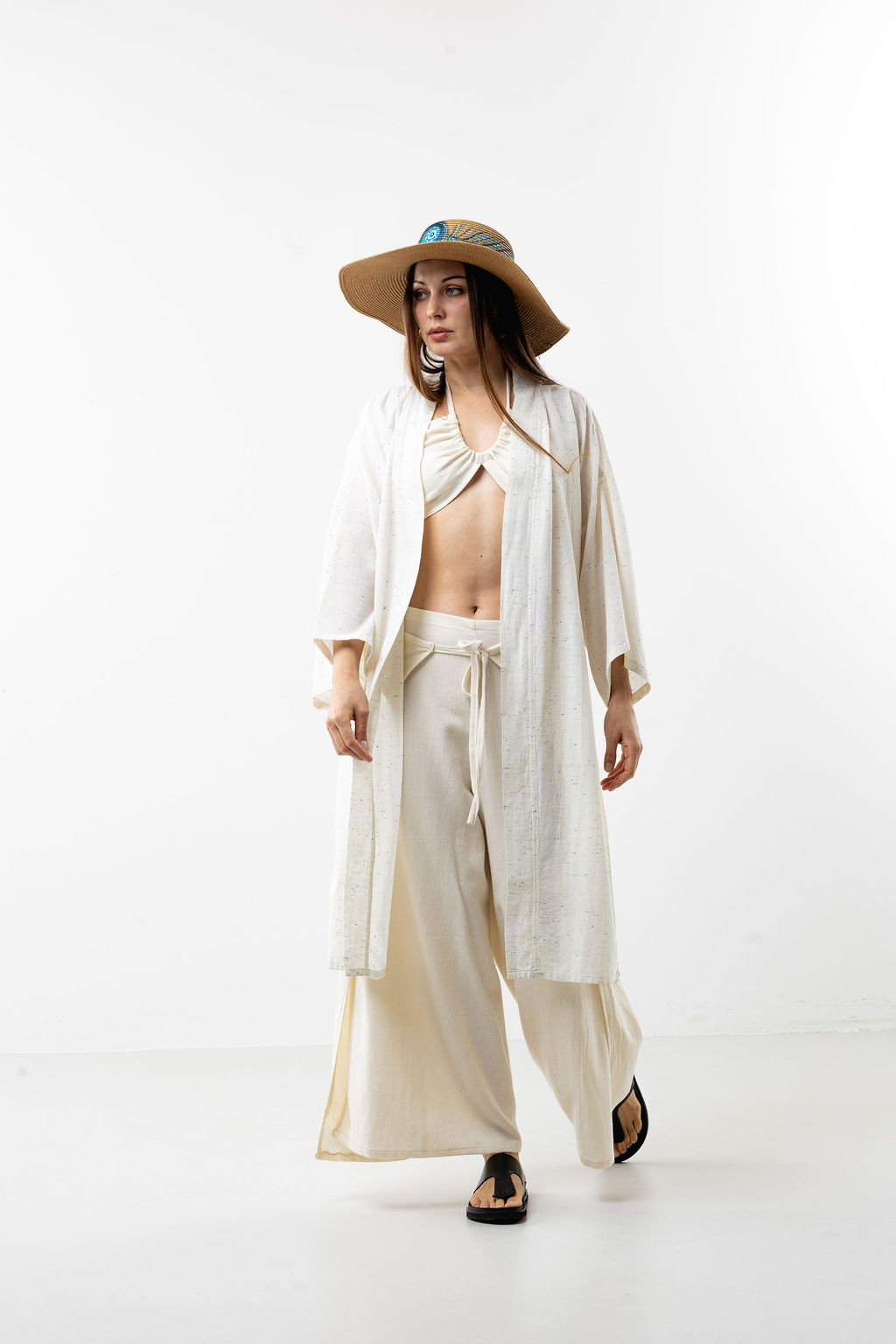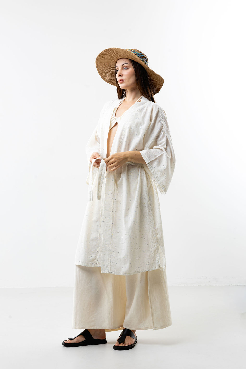 Hand-painted speckled linen kimono with a unique jellyfish design on the back. Lightweight and versatile, perfect for layering over muslin shorts or pants sets, jeans, or casual summer outfits. Ideal for home, outdoor wear, or a day at the beach in mild spring or summer weather.
