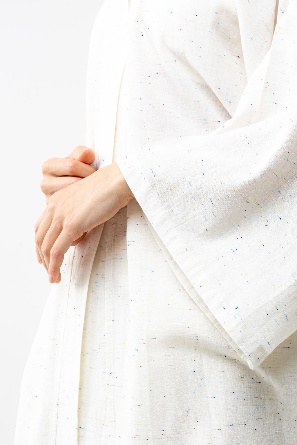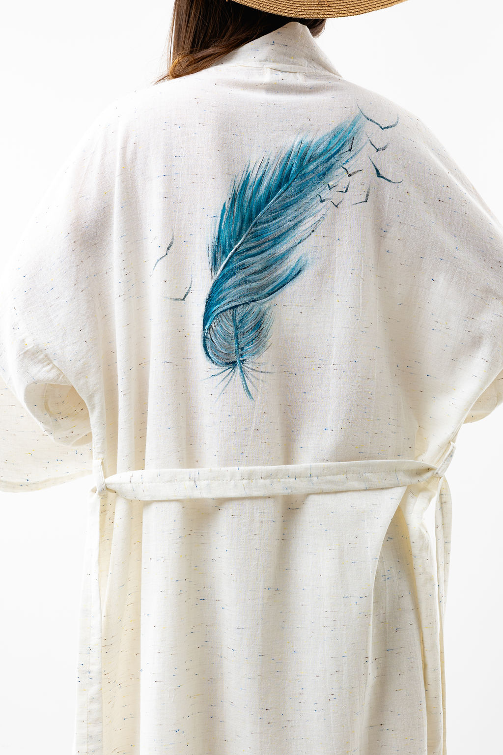 Elevate your wardrobe with our Hand-Painted Speckled Linen Kimono, featuring a one-of-a-kind blue feather design on the back. Crafted from breathable speckled linen, this kimono combines style, comfort, and versatility.