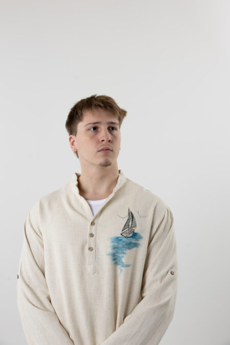 Crafted from premium lightweight handwoven linen, this slim fit natural cream shirt features an exclusive hand-painted sail boat motif on the chest, symbolizing freedom, adventure, and calm seas.