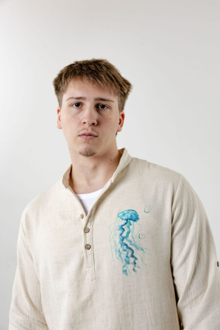 Crafted from premium lightweight handwoven linen, this slim fit natural cream shirt features an exclusive hand-painted jellyfish motif on the chest, symbolizing grace, fluidity, and oceanic beauty.