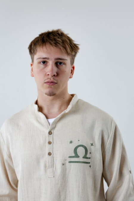Made from premium lightweight handwoven linen, this slim fit summer shirt in natural cream features an exclusive hand-painted Libra (Zodiac) symbol on the chest – a timeless expression of balance, harmony, and style.