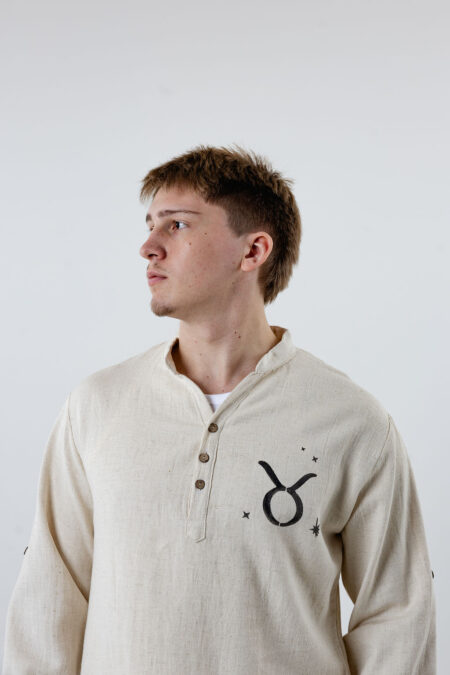 Featuring an exclusive hand-painted Taurus (Zodiac) symbol on the chest, this slim fit summer shirt blends comfort, strength, and artisanal craftsmanship — ideal for warm days, evening gatherings, or special occasions.