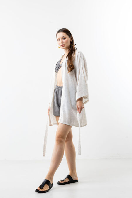 115,00 €Hand-painted speckled linen kimono with a unique jellyfish design on the back. Lightweight and versatile, perfect for layering over muslin shorts or pants sets, jeans, or casual summer outfits. Ideal for home, outdoor wear, or a day at the beach in mild spring or summer weather.