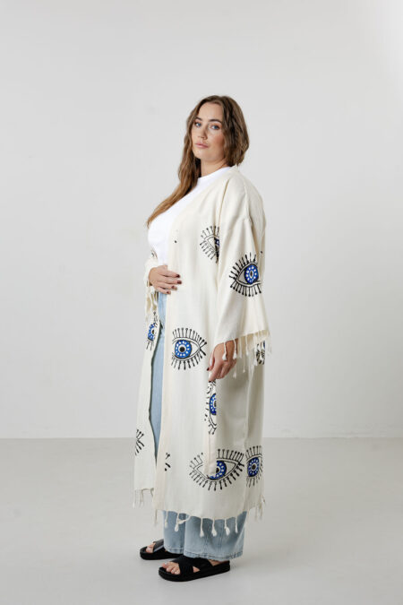 95,00 €Elevate your summer wardrobe with the Blue Protection Kimono – Handcrafted Turkish Cotton. Made from 100% breathable Turkish cotton with handmade block print patterns inspired by the iconic Turkish blue protection charm, this lightweight kimono is perfect as a daily layer, spa robe, or chic beach cover-up. Tassel details and a waist tie add a stylish boho touch.