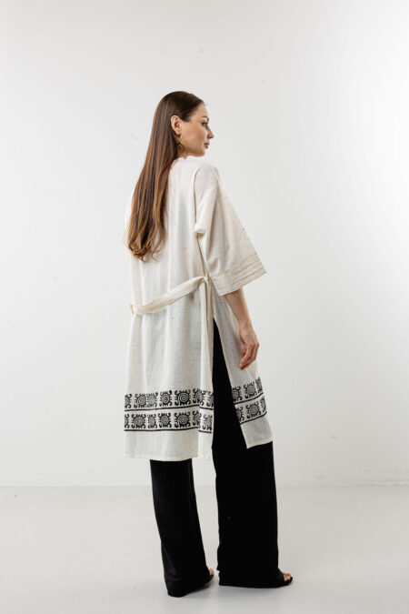 115,00 €Handcrafted from a unique speckled linen blend — woven by combining premium Turkish cotton and natural linen fibers — the Celestial Symbol Long Kimono & Tunic brings together breathability, elegance, and artisanal design. Adorned with black woodblock prints inspired by celestial harmony, this versatile piece can be styled as a kimono, tunic, or long cardigan for timeless boho sophistication.