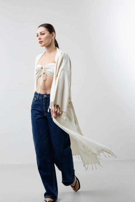 95,00 €Handcrafted from 100% Turkish cotton using the traditional balloon weave technique, the Woven Rhythm Crop Cardigan combines modern design with timeless craftsmanship. Featuring a double-layer peshtemal texture and single-button closure, this relaxed, Free-size cardigan fits Small to Large sizes comfortably — perfect for all seasons.