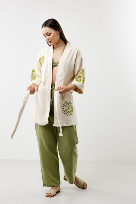 Lightweight, breathable, and effortlessly elegant — perfect for layering over your summer outfits or relaxing at home in natural comfort.The Azure Kimono reflects the essence of natural craftsmanship — a timeless, breathable, and soulful piece that brings the beauty of traditional artistry into modern summer wear.