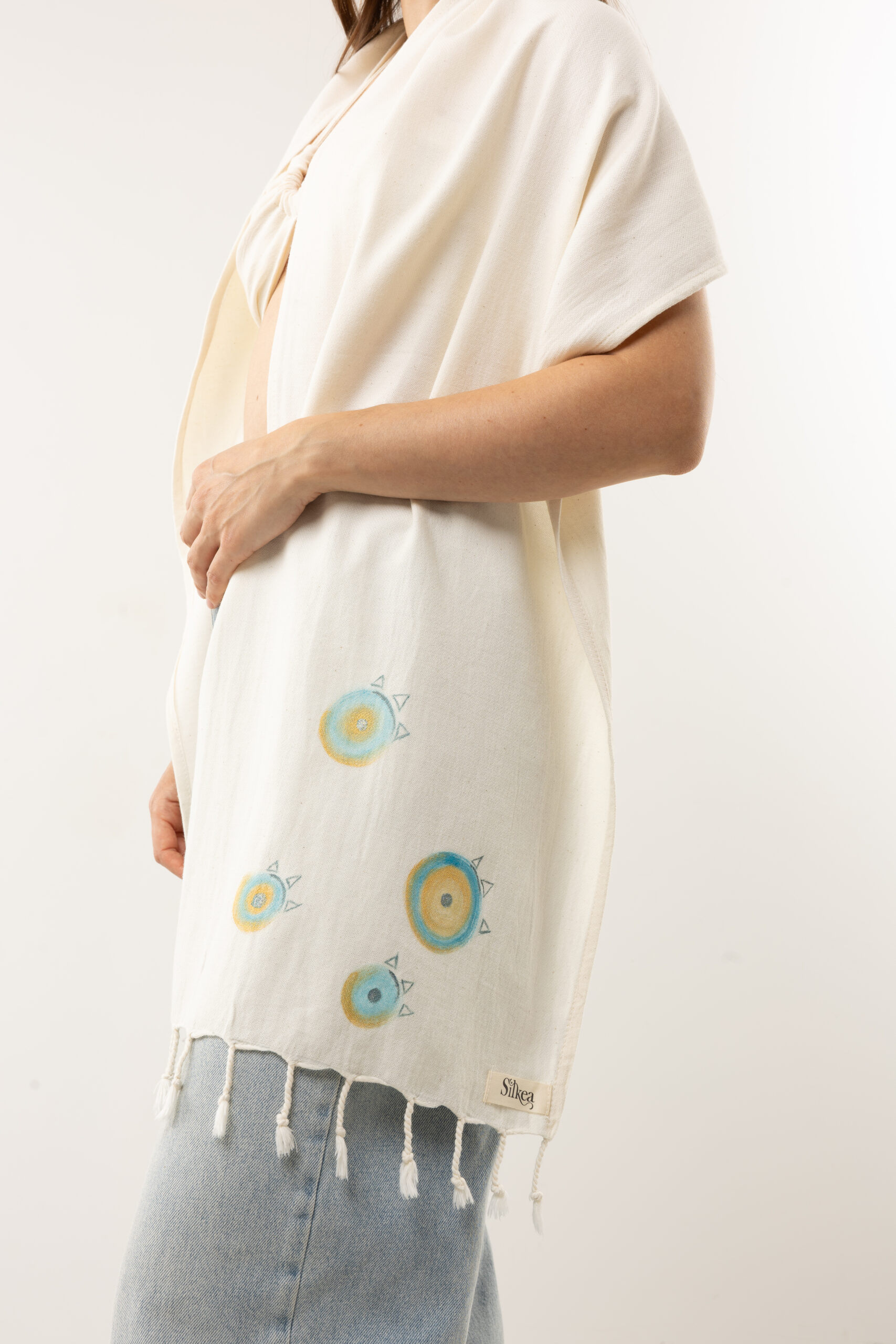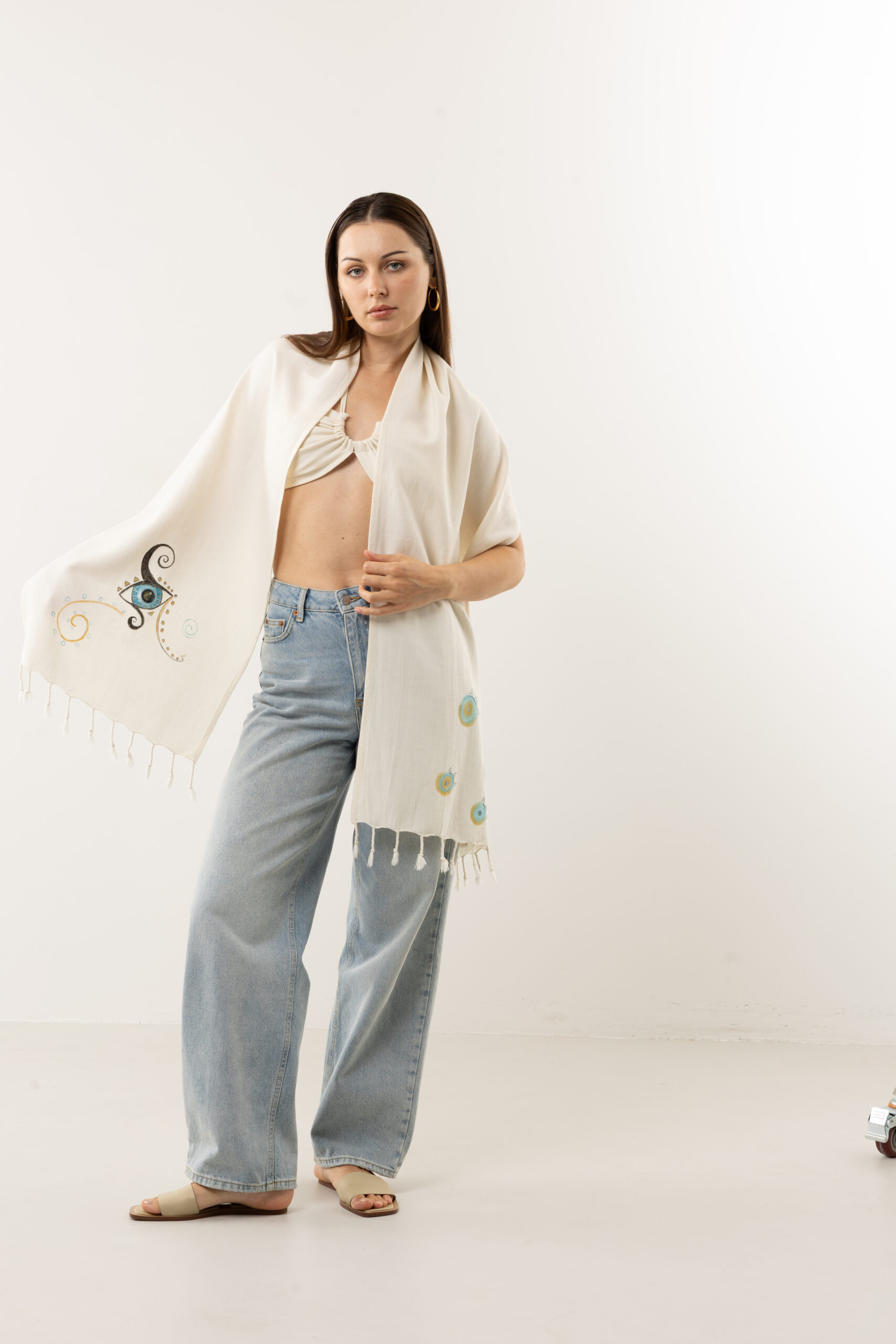 Wrap yourself in elegance with our Artisanal Hand-Painted Lucky Eye Cotton Scarf & Shawl, a versatile all-season accessory designed for effortless elegance. Crafted from 100% natural Turkish cotton and hand-painted with vibrant designs, this accessory is perfect for both daily wear and special occasions.