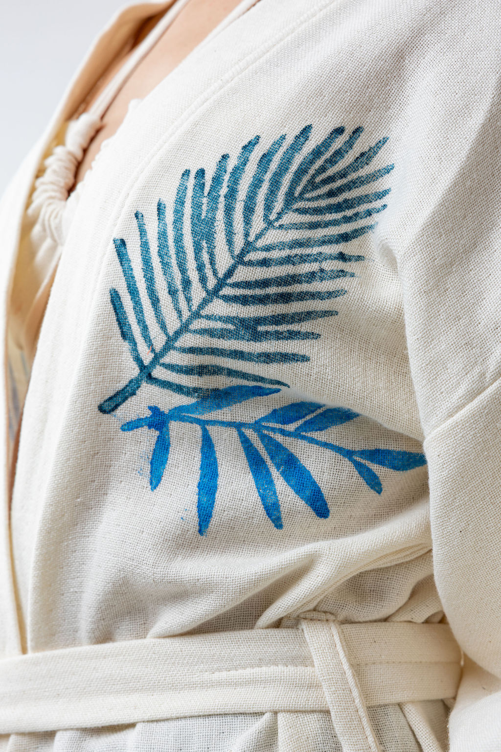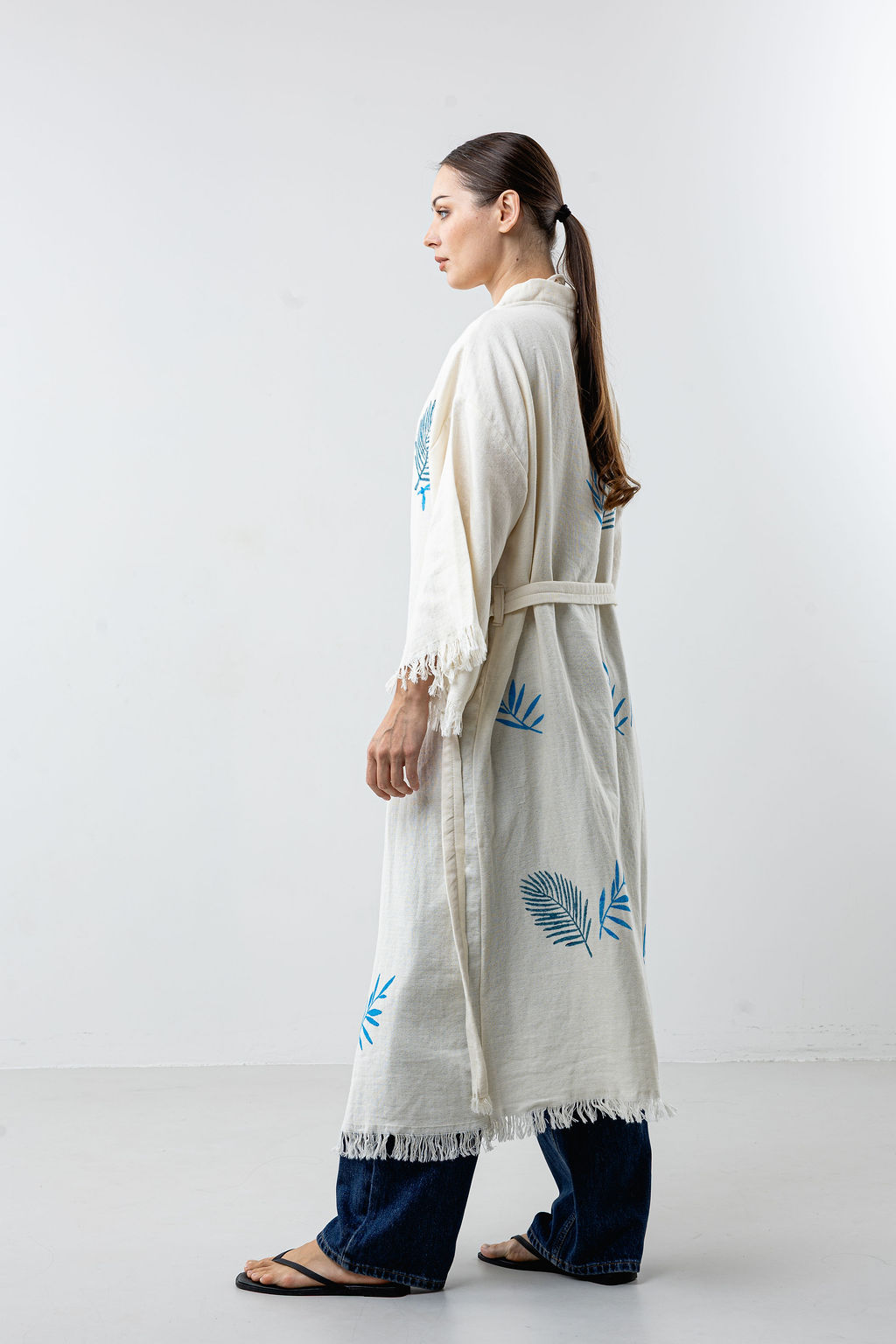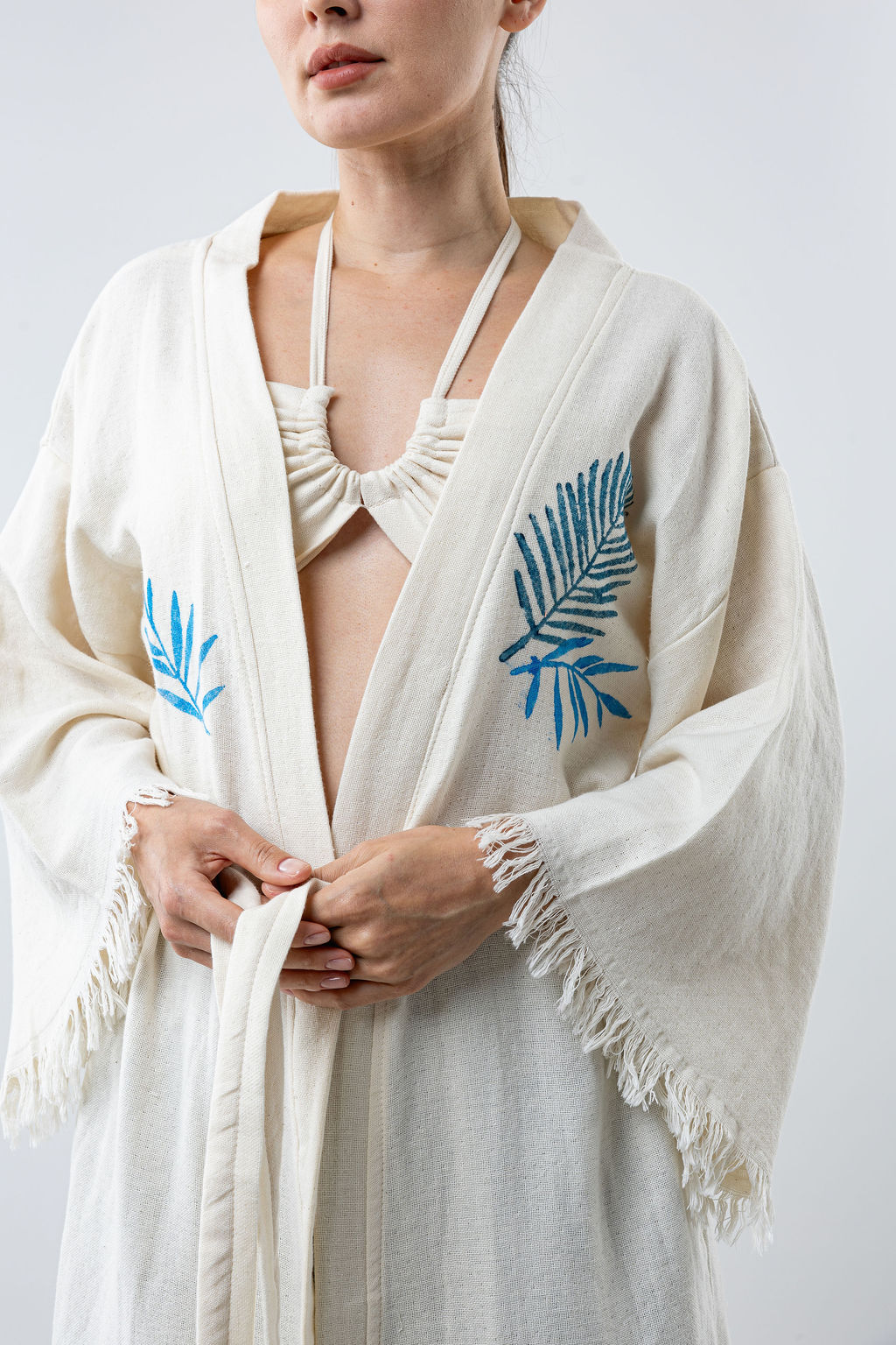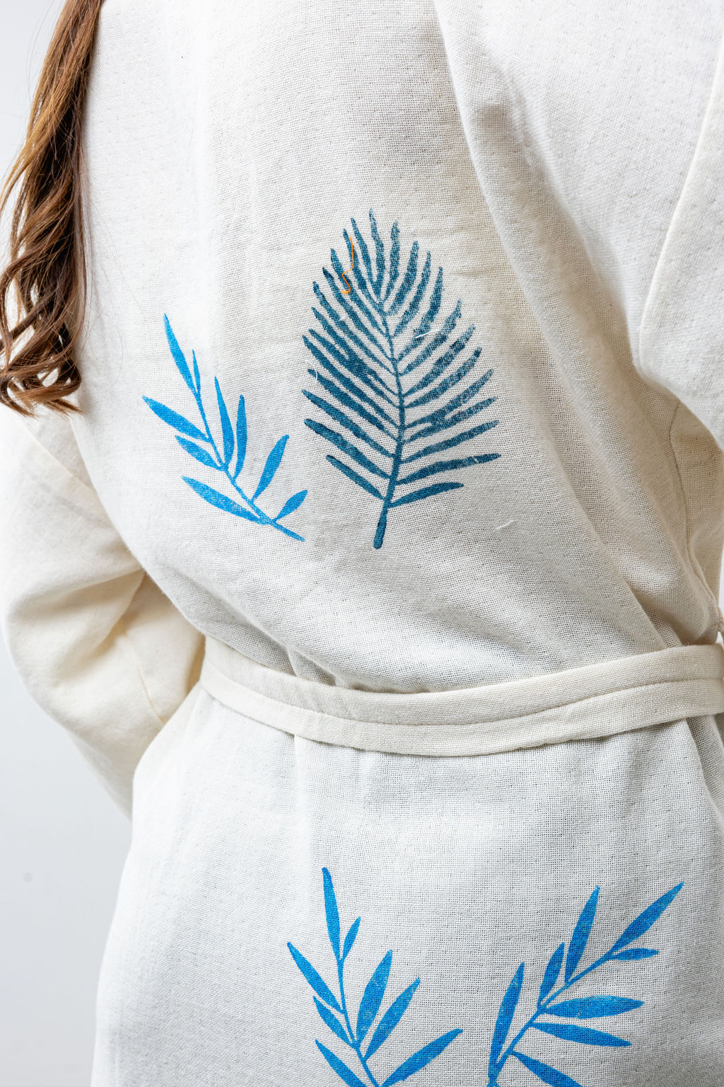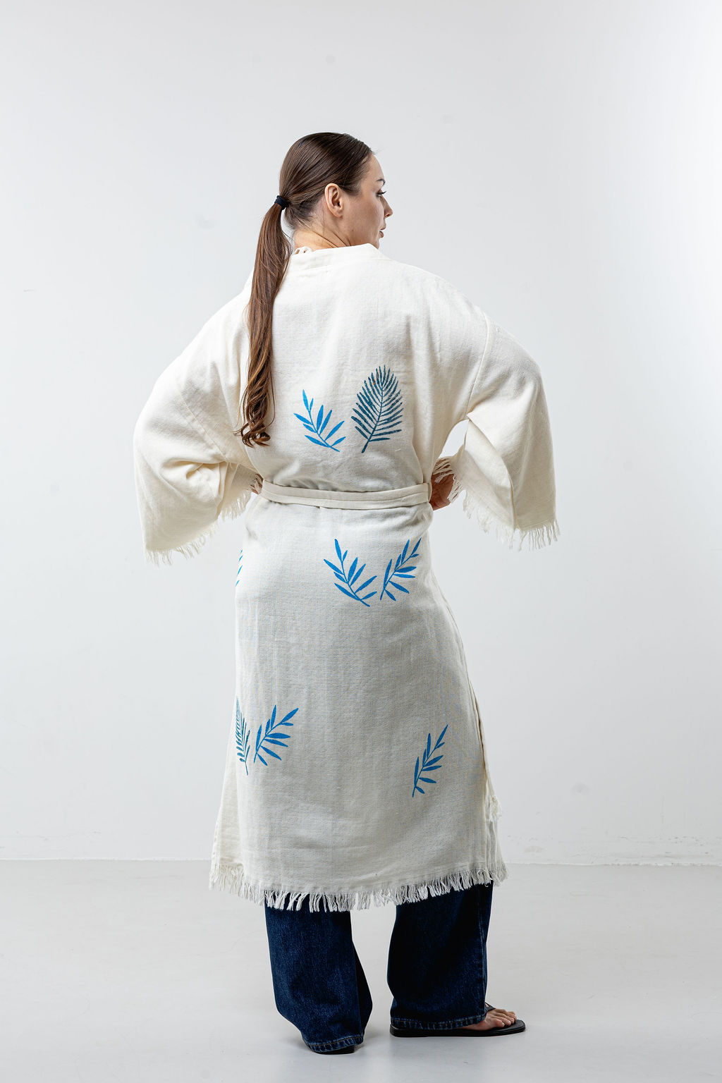 Elevate your wardrobe with the Blue Leaf Styl Long Kimono – Handmade Turkish Cotton Woodblock Design. This artisanal piece is crafted by skilled artisans using 100% premium Turkish cotton and natural dyes. Each kimono features hand-printed blue leaf motifs inspired by nature, offering a one-of-a-kind, sustainable, and stylish garment.