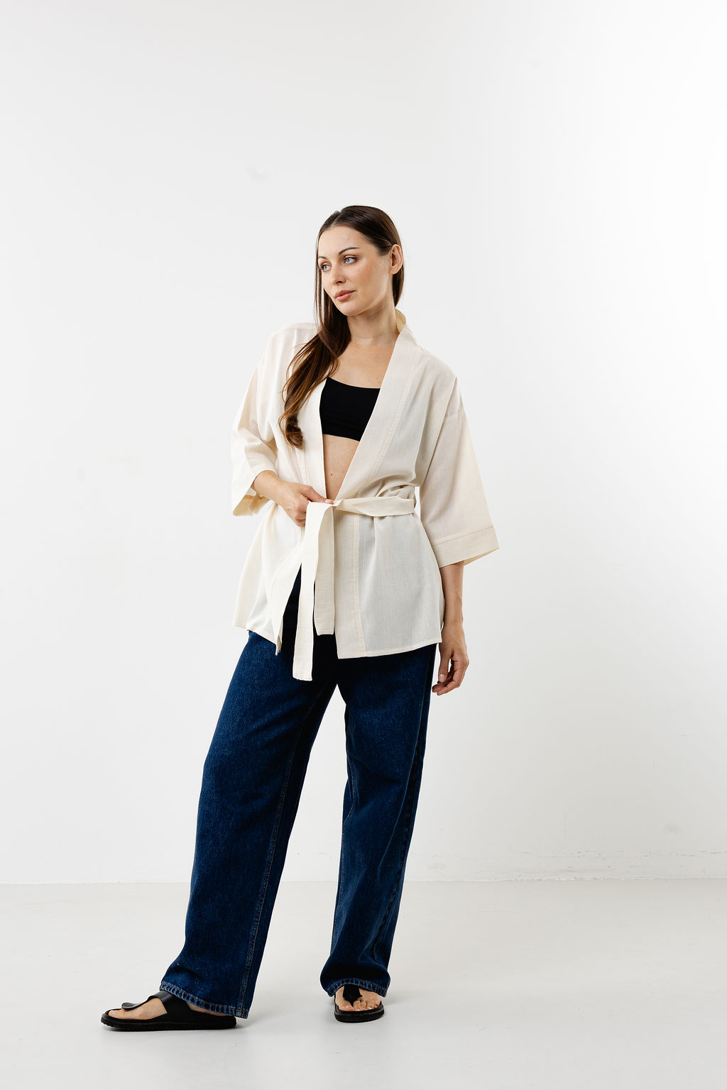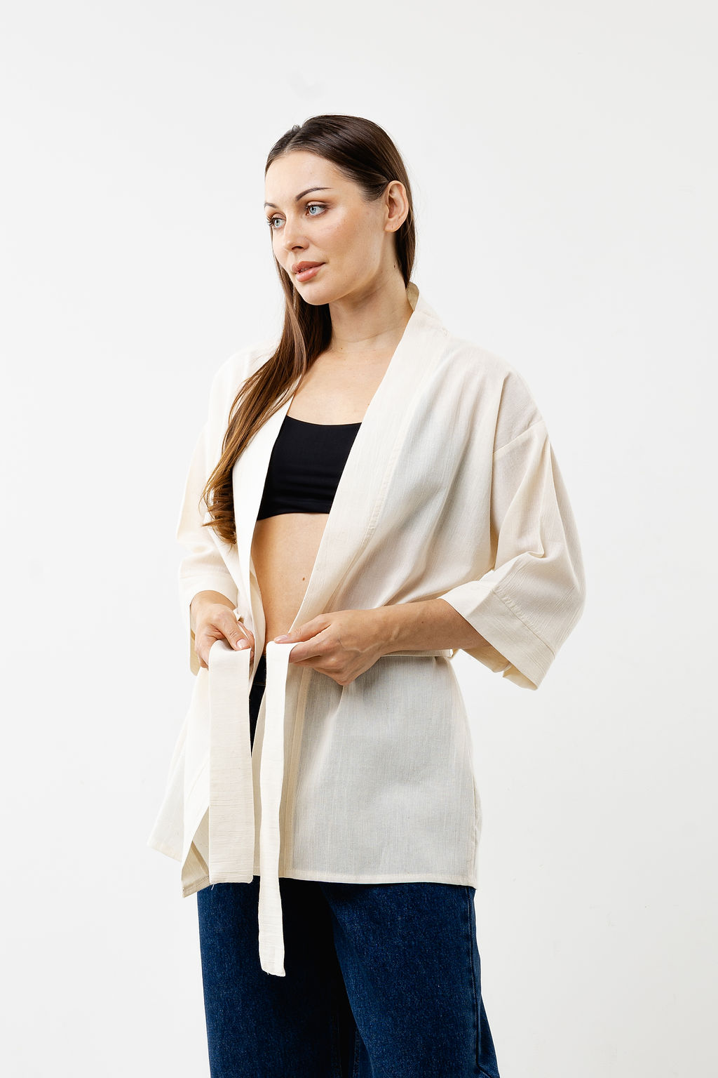 - Design: Wrap-style top jacket with belted waist for adjustable fit