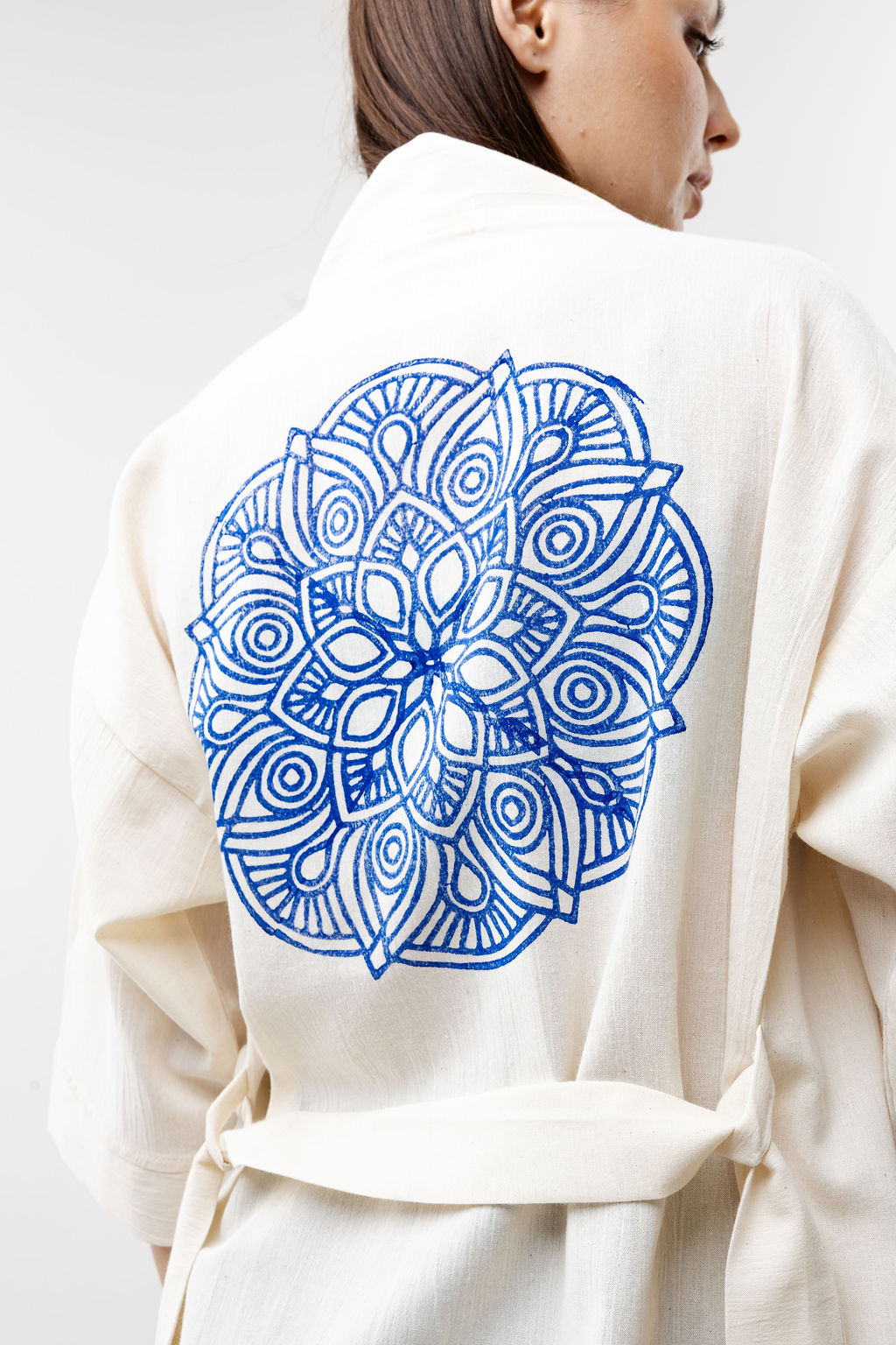 - Color & Print: Natural cream with hand-printed blue Mandala block design