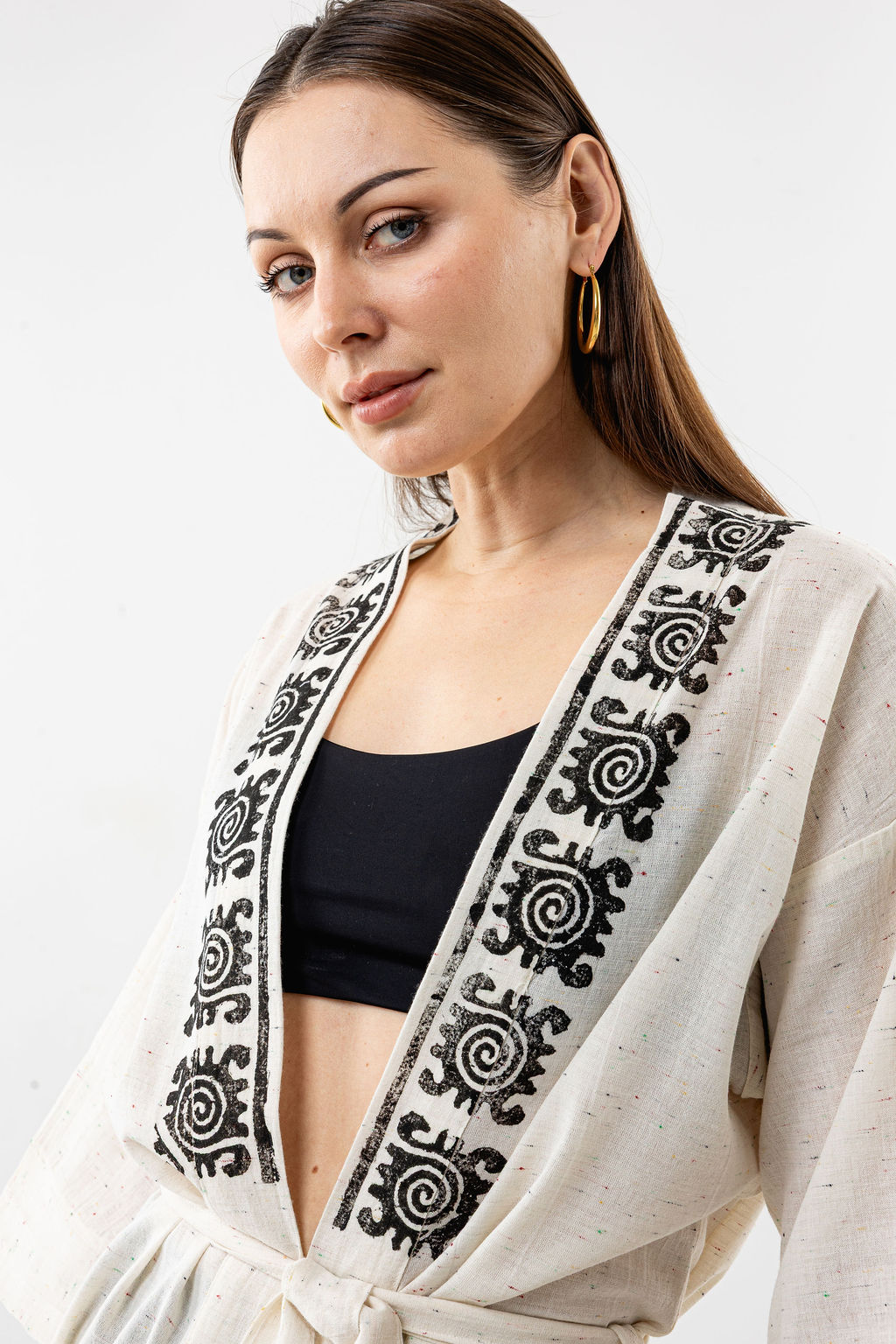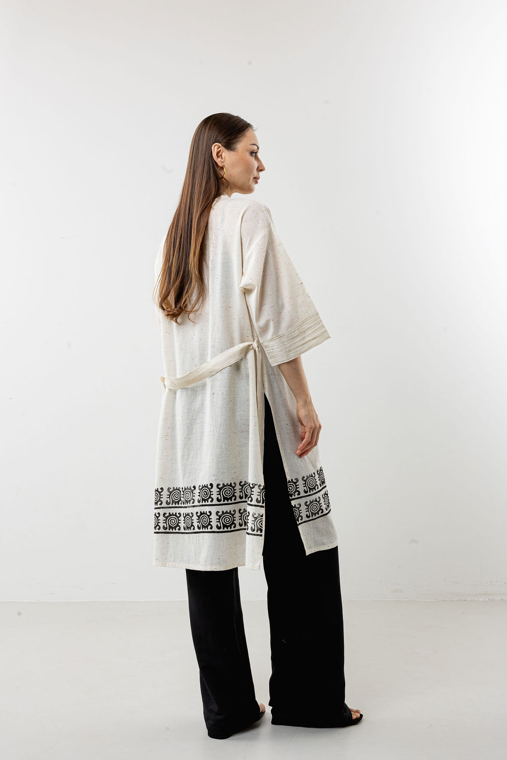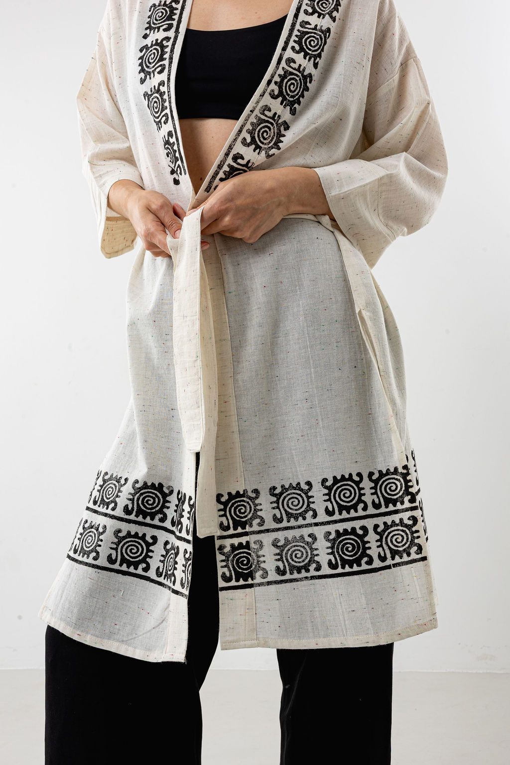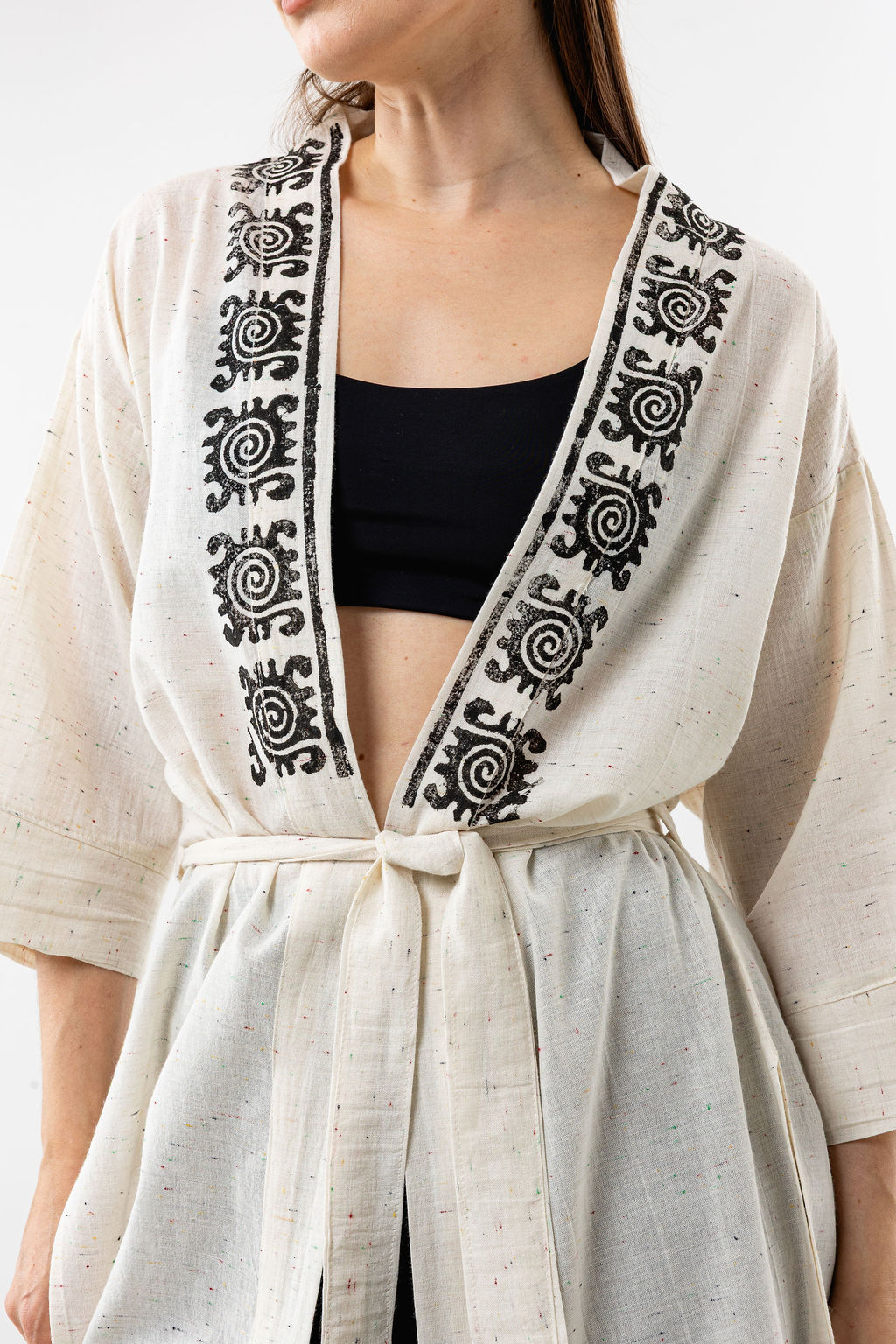 Handcrafted from a unique speckled linen blend — woven by combining premium Turkish cotton and natural linen fibers — the Celestial Symbol Long Kimono & Tunic brings together breathability, elegance, and artisanal design. Adorned with black woodblock prints inspired by celestial harmony, this versatile piece can be styled as a kimono, tunic, or long cardigan for timeless boho sophistication.