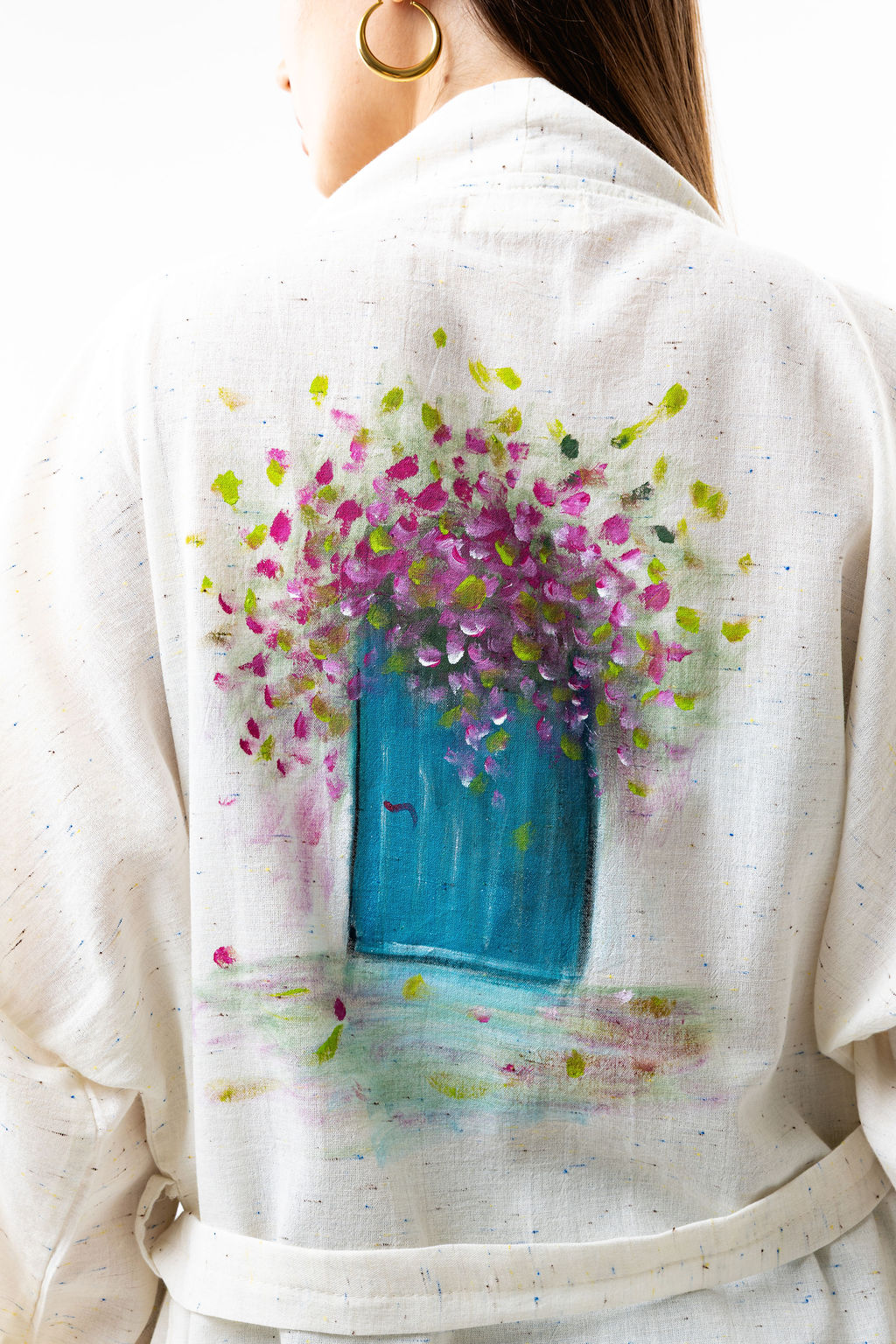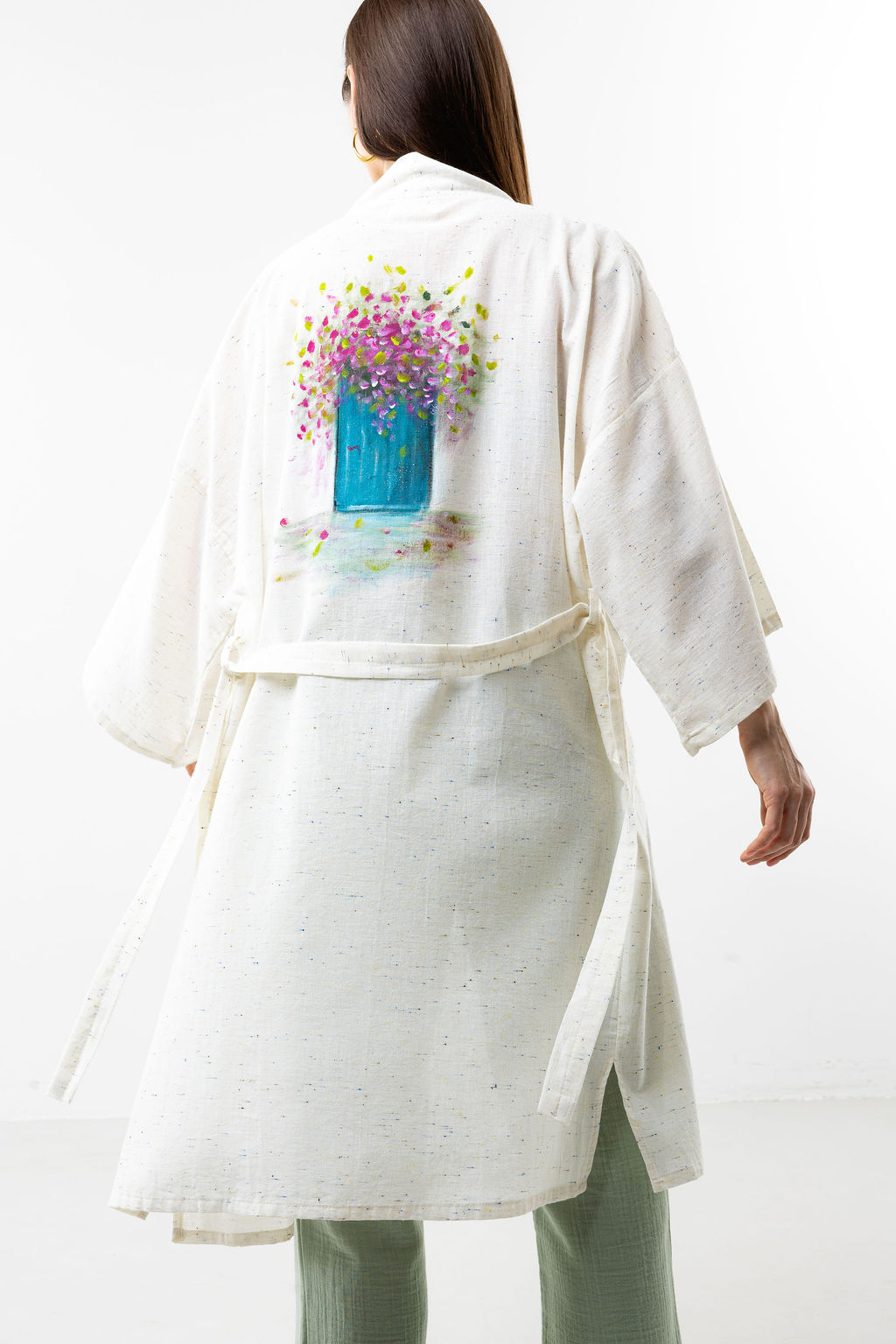 Hand-painted speckled linen kimono with a unique flower pot design on the back. Lightweight and versatile, perfect for layering over muslin shorts or pants sets, jeans, or casual summer outfits. Ideal for home, outdoor wear, or a day at the beach in mild spring or summer weather.