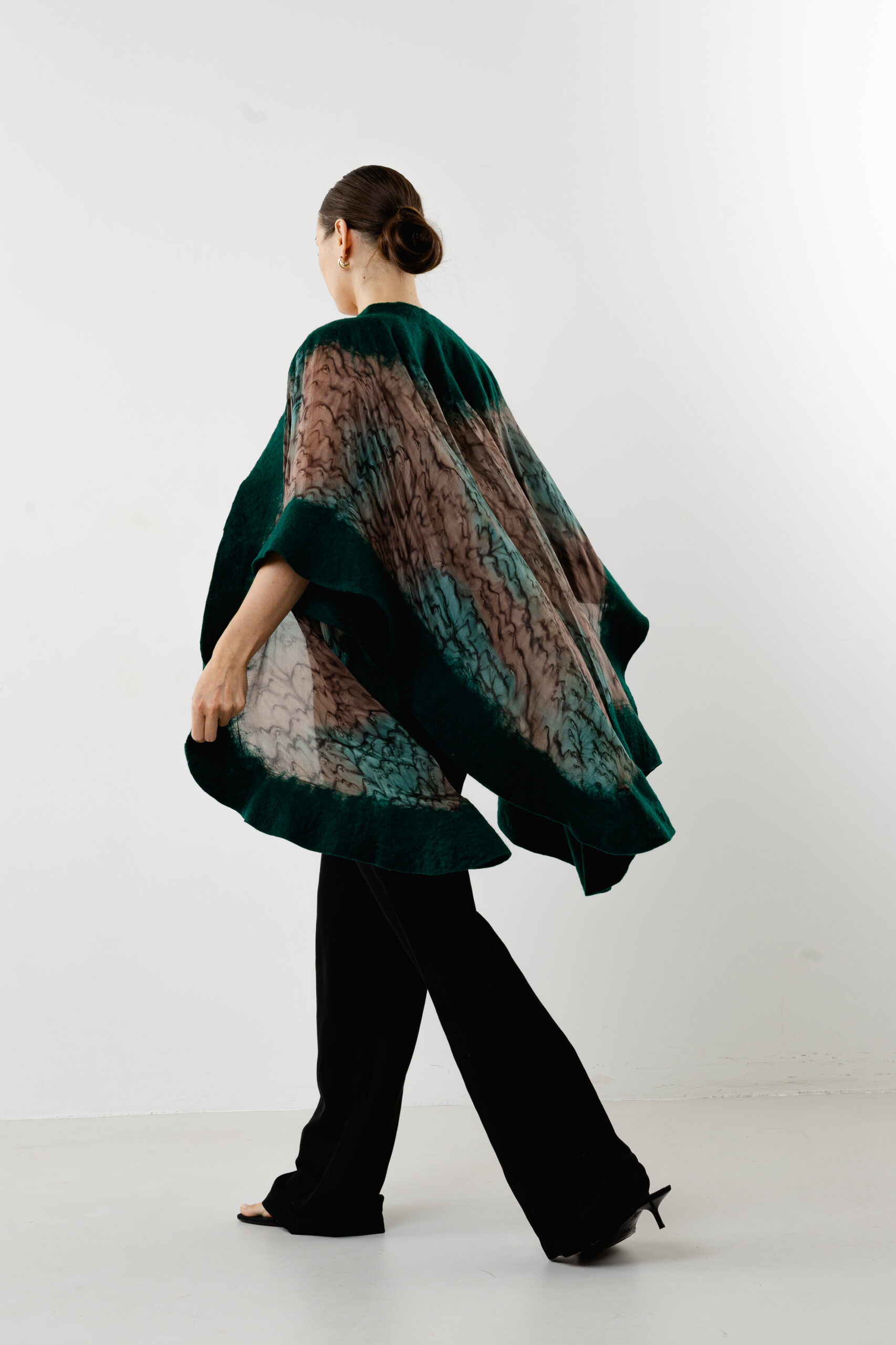 Hand-painted forest green luxury silk poncho - Forest Elegance collection