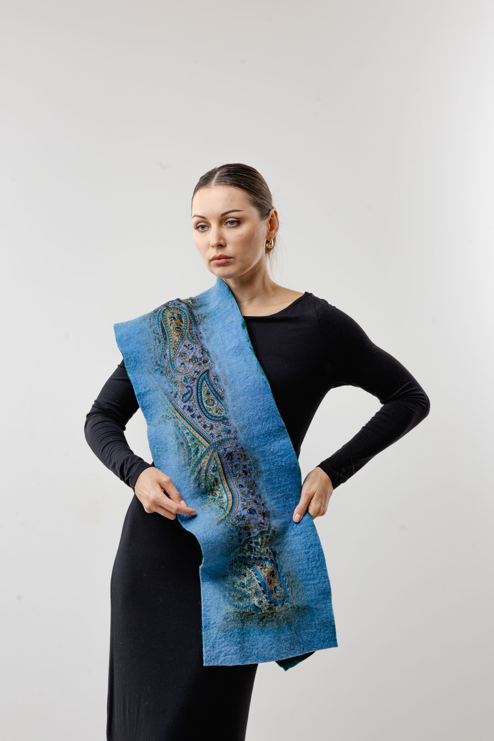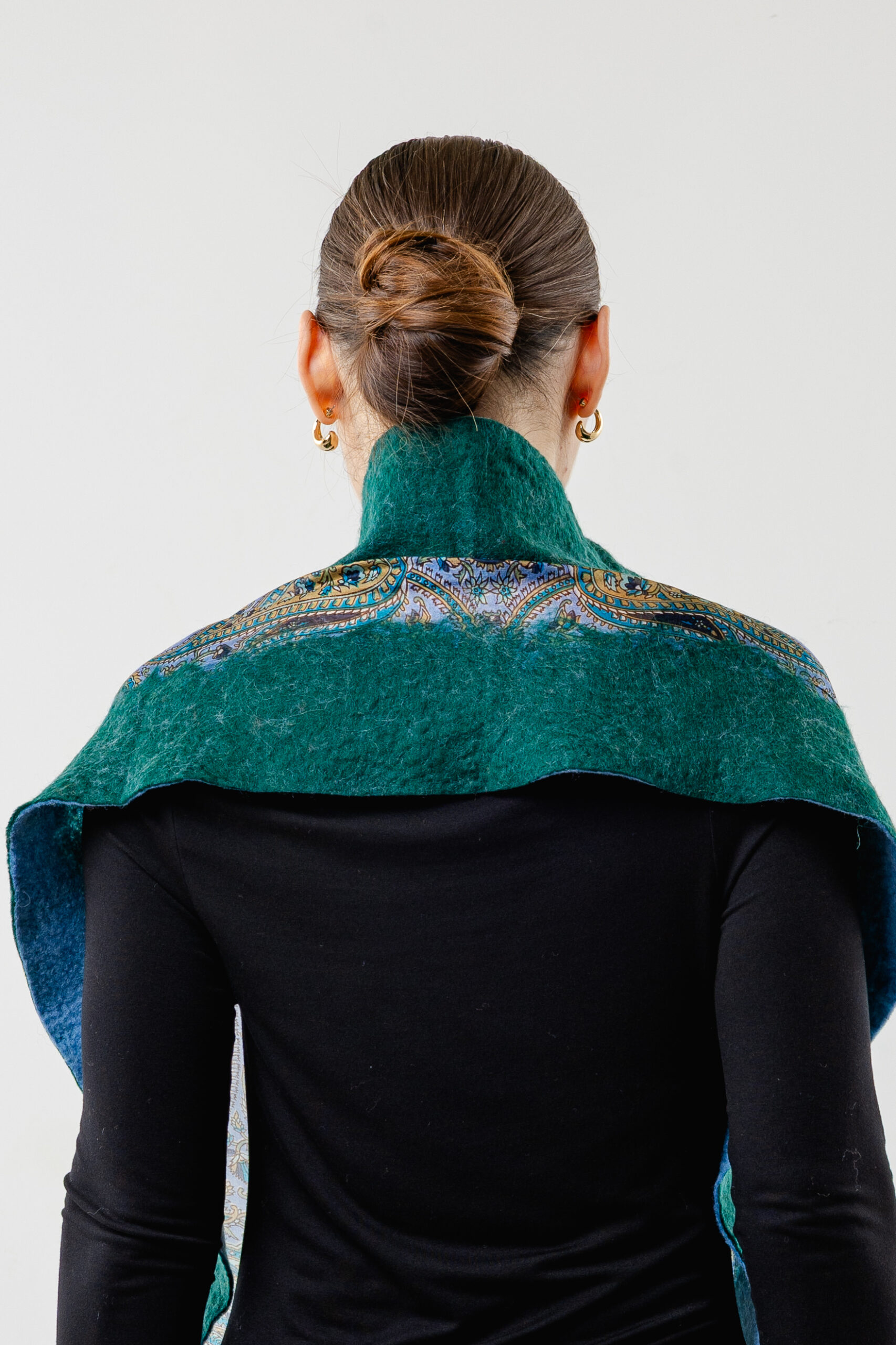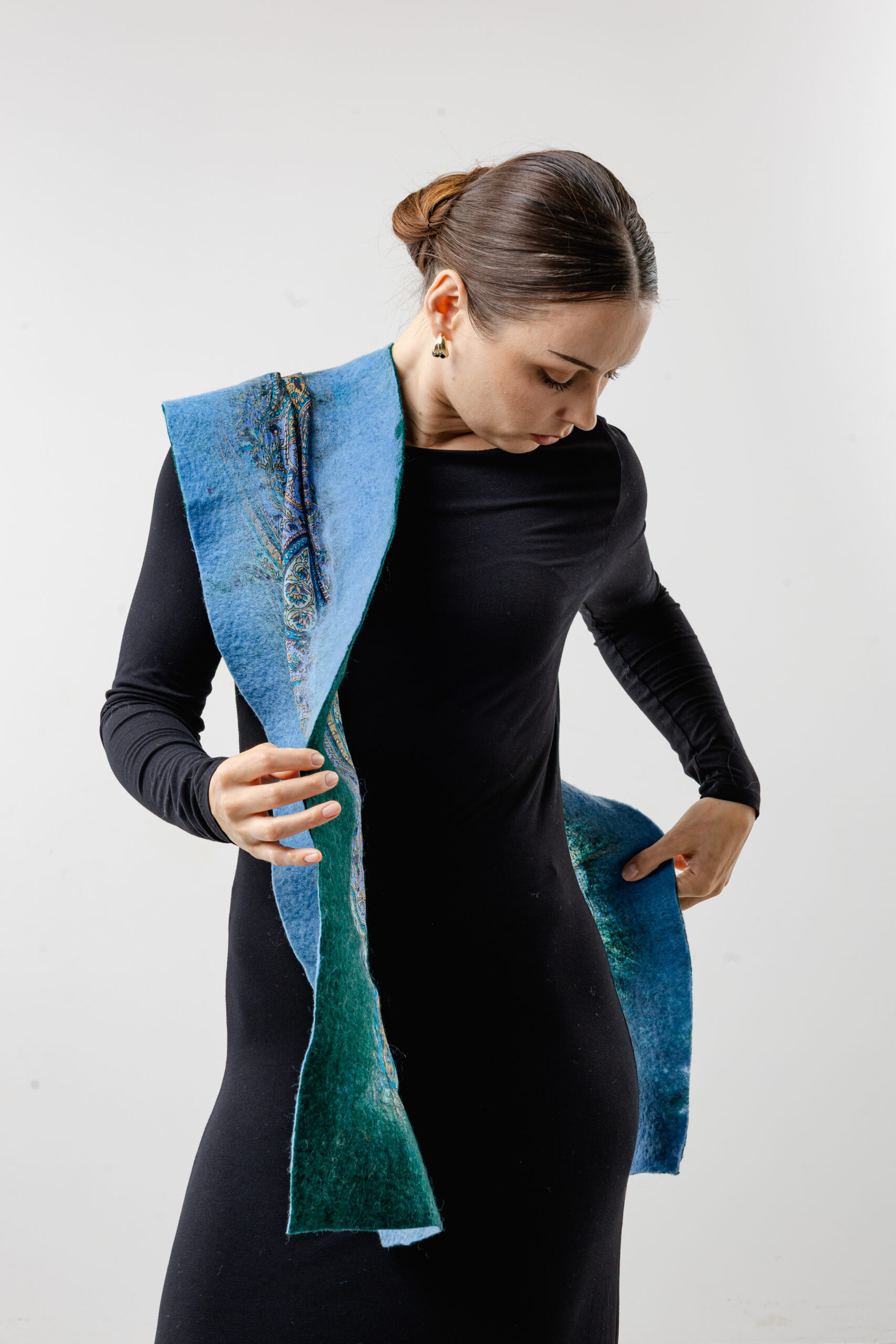 Each shawl is a testament to meticulous craftsmanship. Hand-felted Merino wool forms a soft, structured texture, while delicately draped silk panels create flowing elegance. Designed with a reversible layout, each side presents a distinct texture and tone, yet both are perfectly balanced to complement one another. This versatility allows you to wear it in multiple ways, adding a fresh perspective and refined sophistication every time.
