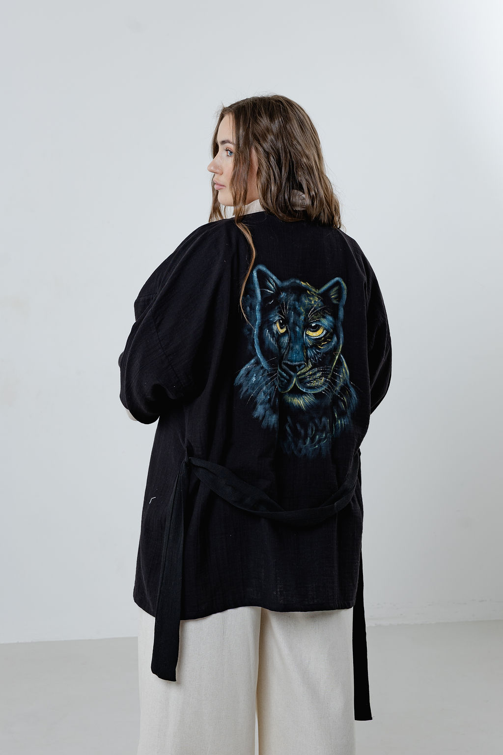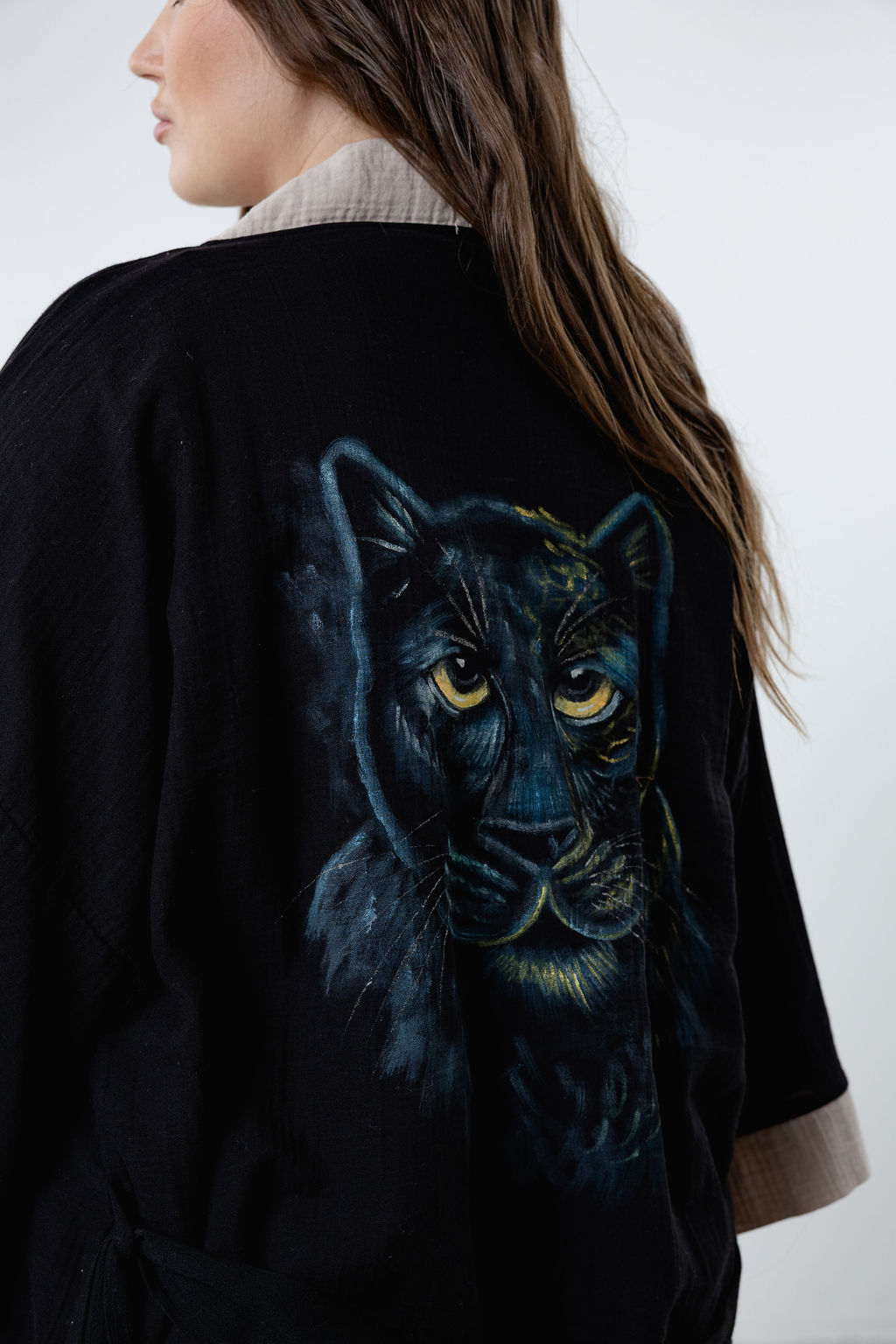 Elevate your wardrobe with the Hand-Painted Puma Kimono Robe – Unisex All-Season Wrap for Home, Spa & Beach.