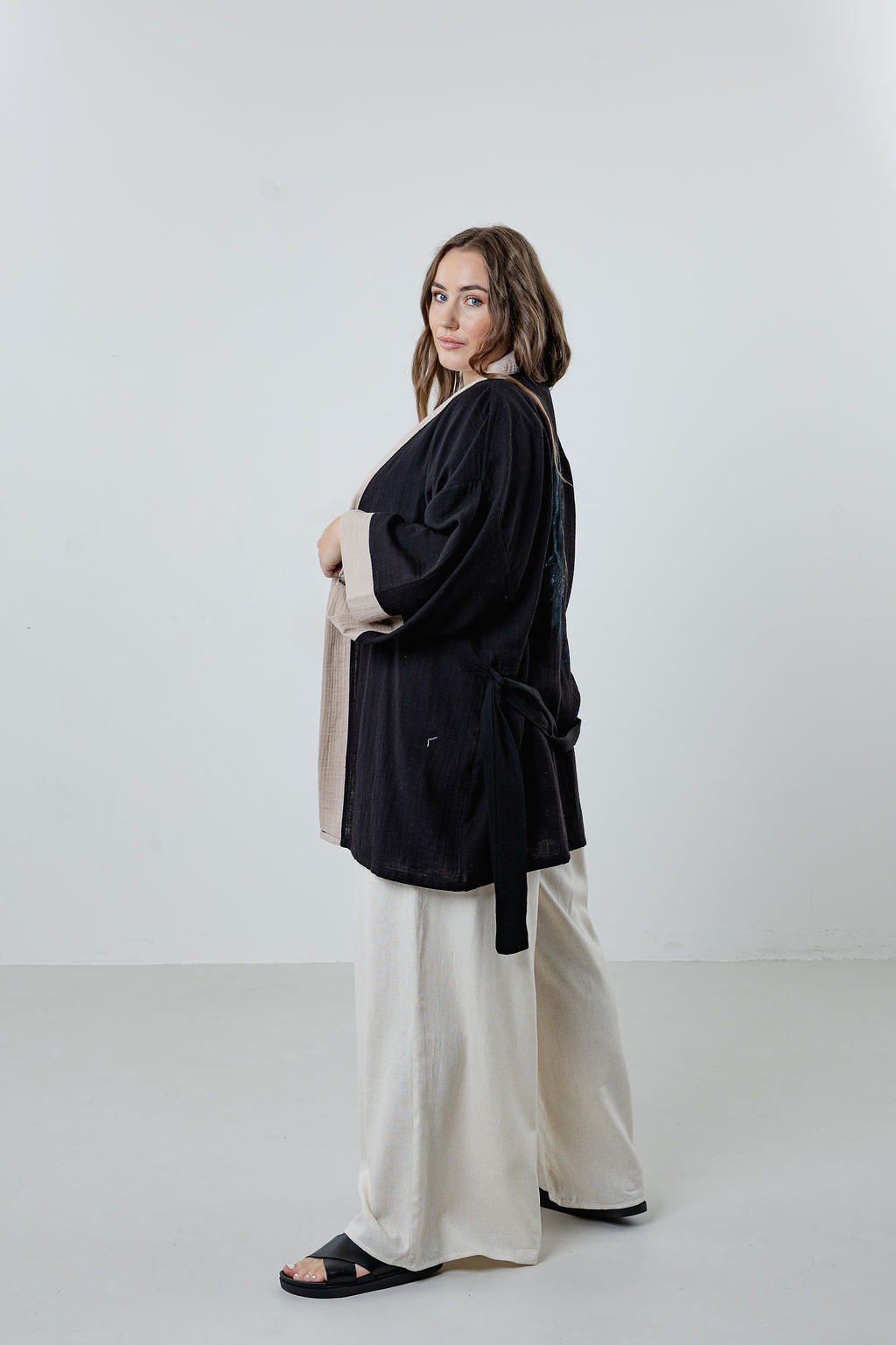 • Details: Long, loose cut; waist tie closure; versatile styling options