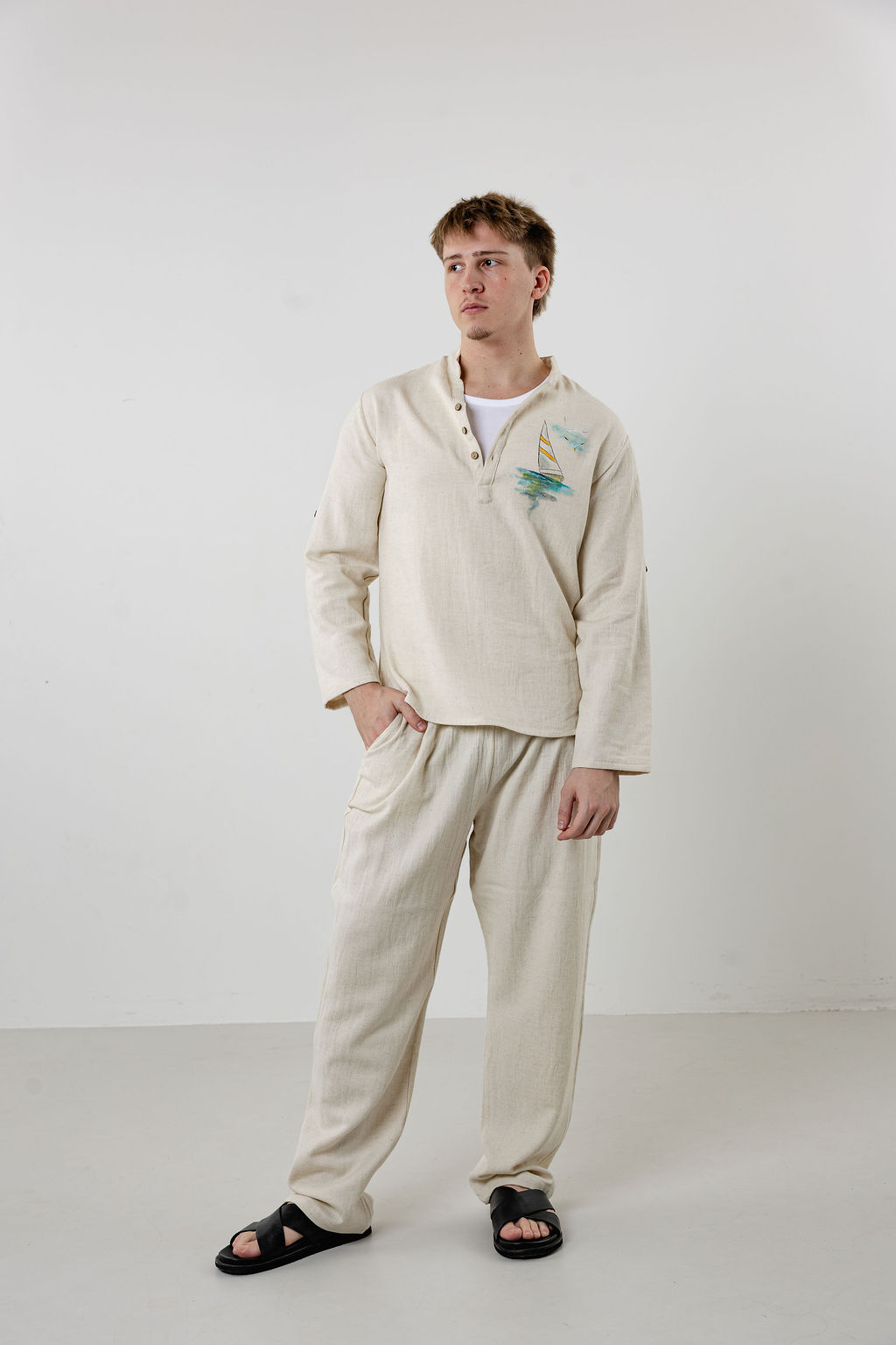 • Design: Men’s long-sleeve linen shirt with minimalist button closure and artisan artwork