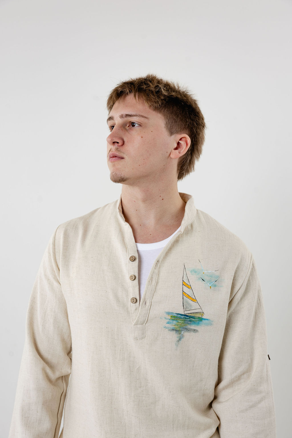 Crafted from premium lightweight handwoven linen, this slim fit natural cream shirt features an exclusive hand-painted sail boat motif on the chest, symbolizing freedom, adventure, and calm seas.