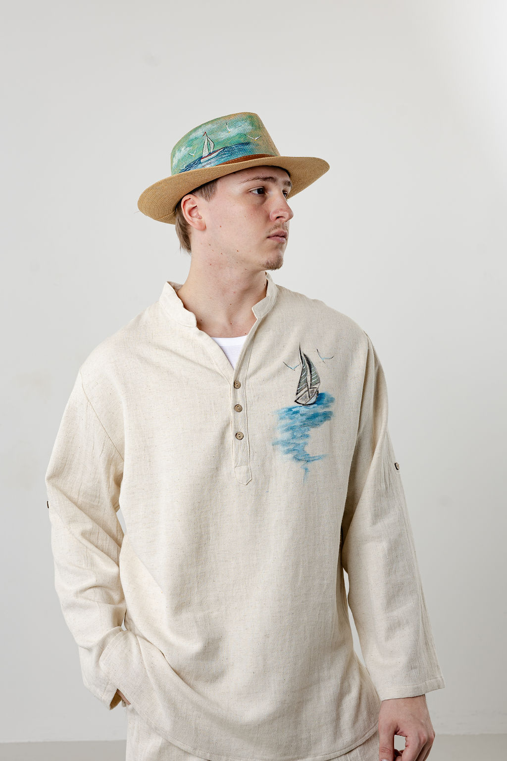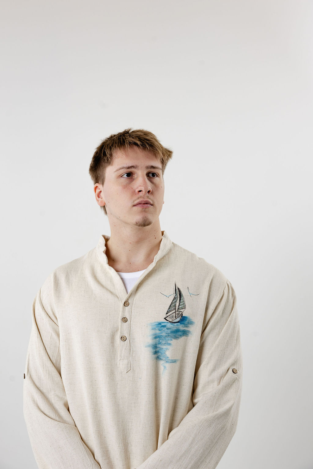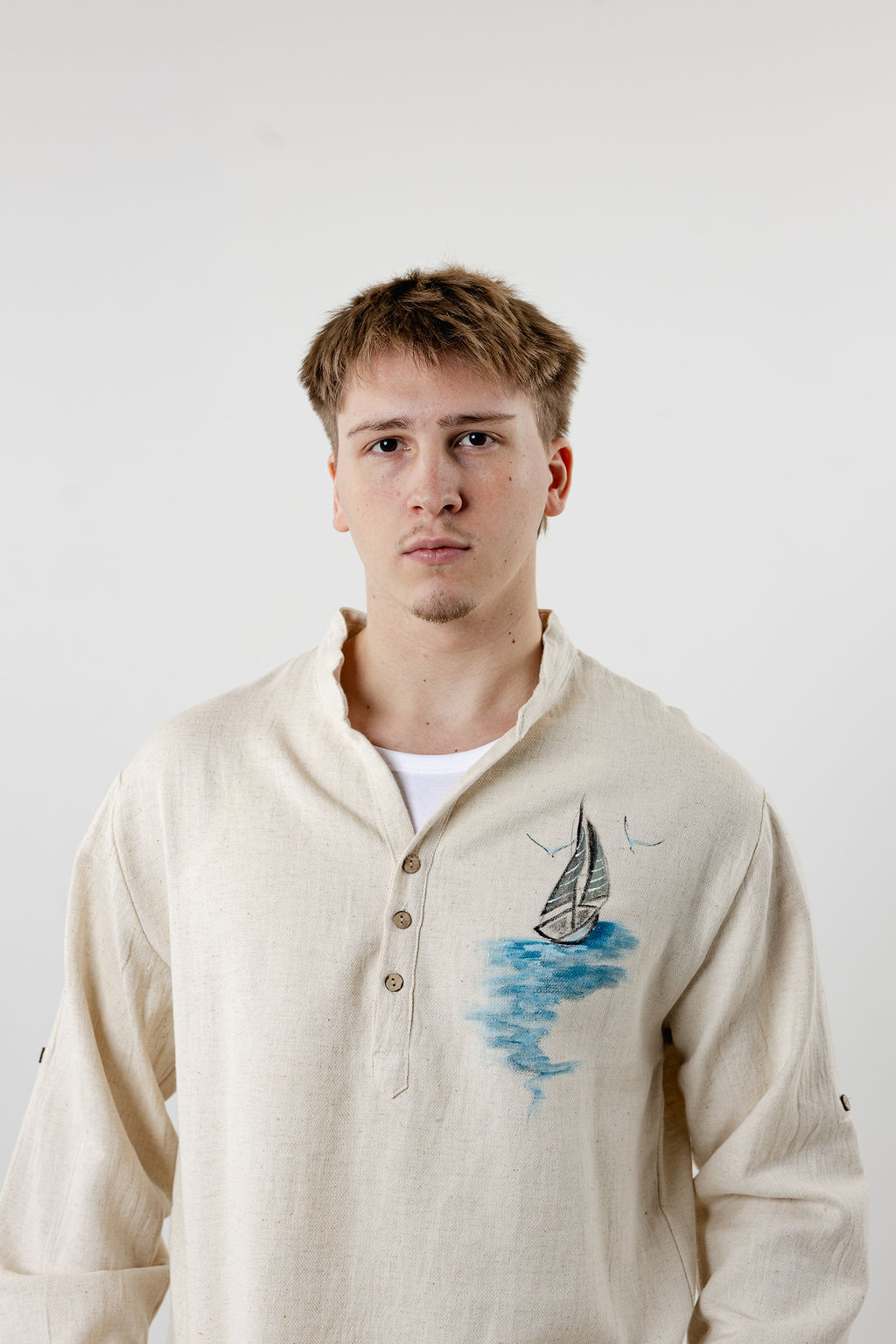 Crafted from premium lightweight handwoven linen, this natural cream shirt features an exclusive hand-painted sailing motif on the chest, symbolizing freedom, adventure, and calm seas.