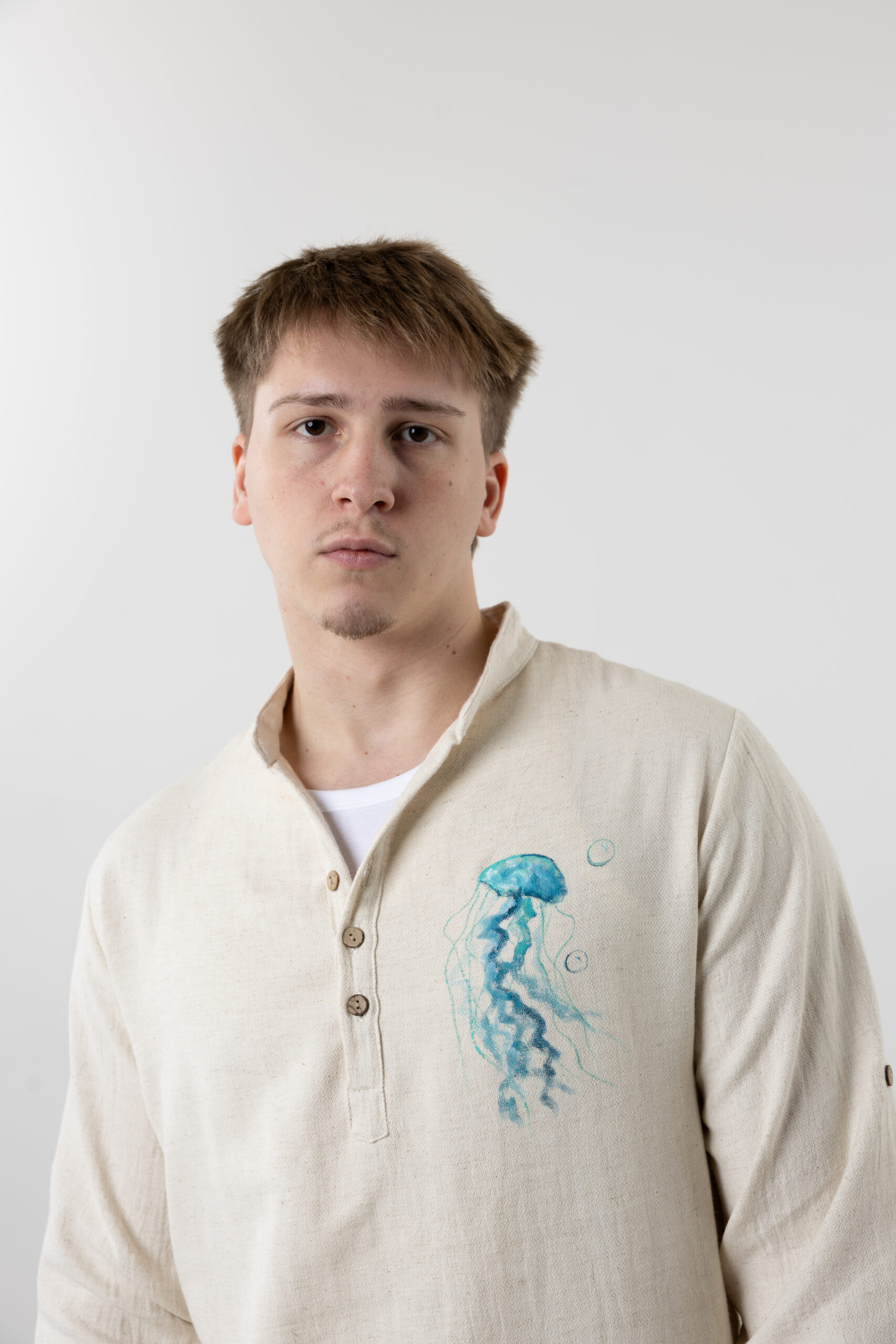 Men’s Henley linen-cotton shirt in natural cream with hand-painted jellyfish design.