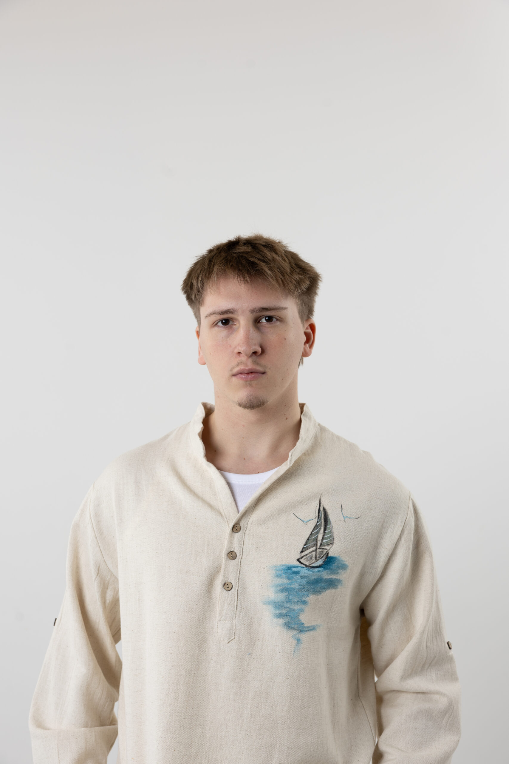 Men’s Henley Linen-Cotton Shirt – Natural Cream with Hand-Painted Sailing Design