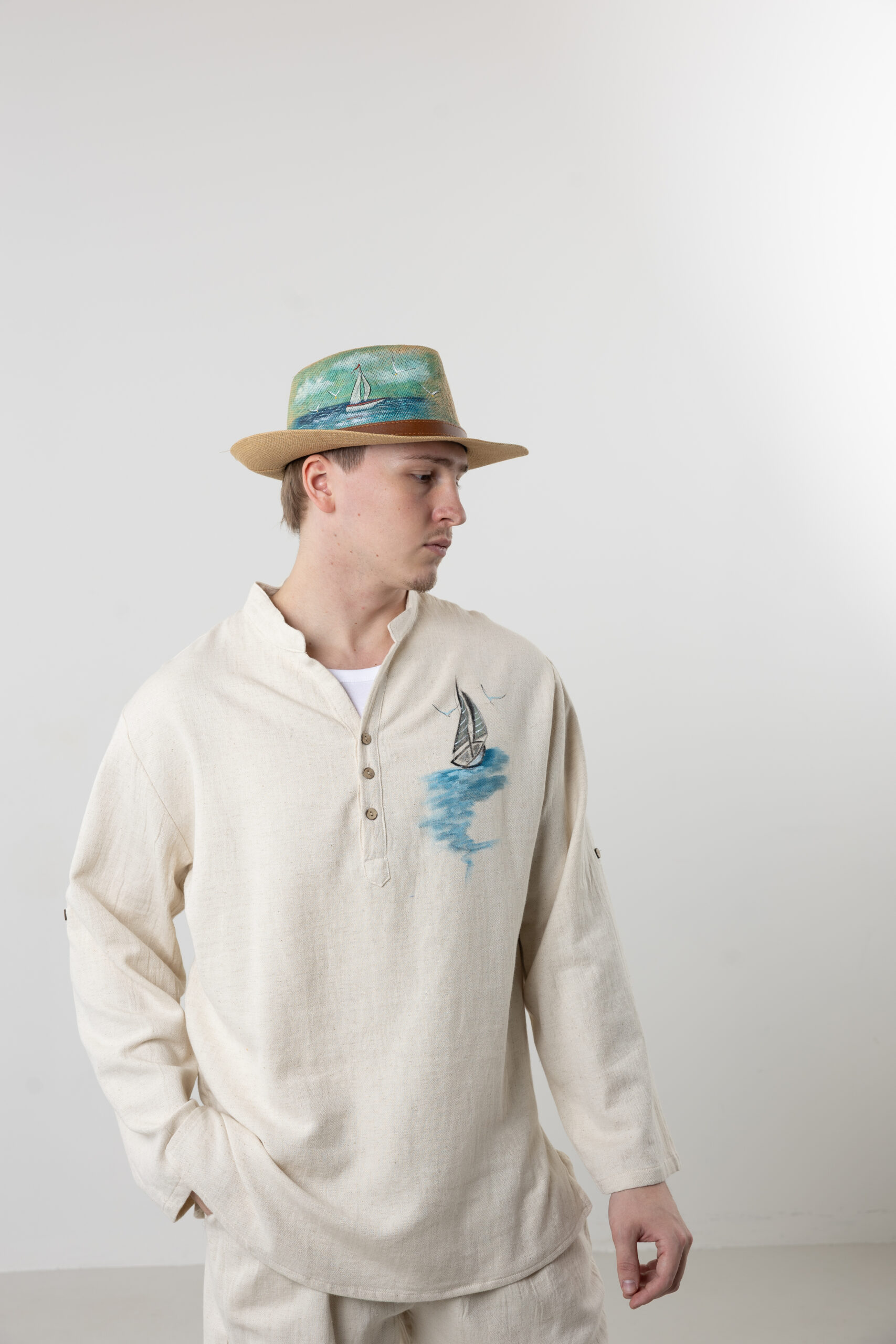 Why Choose the Men’s Henley Linen-Cotton Shirt – Natural Cream with Hand-Painted Sailing Design?