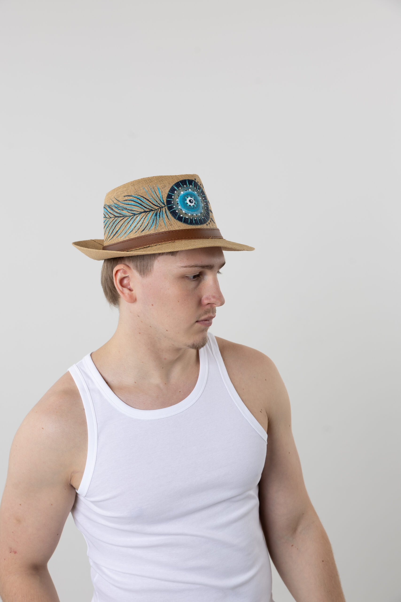 Men’s summer straw fedora hat with hand-painted Lucky Eye pattern.