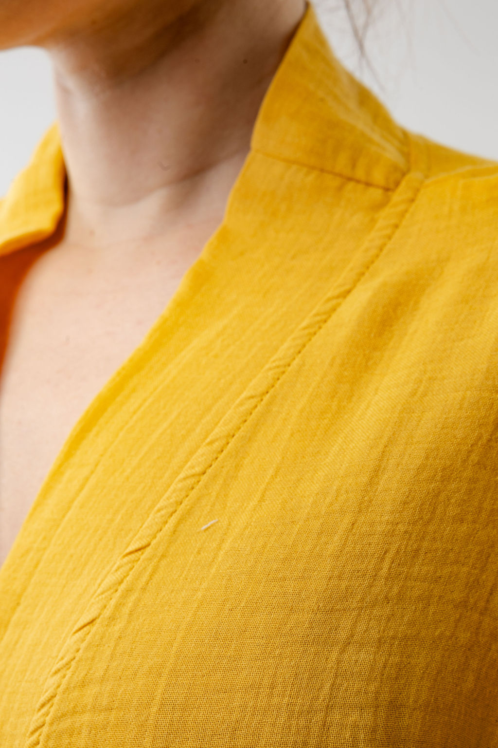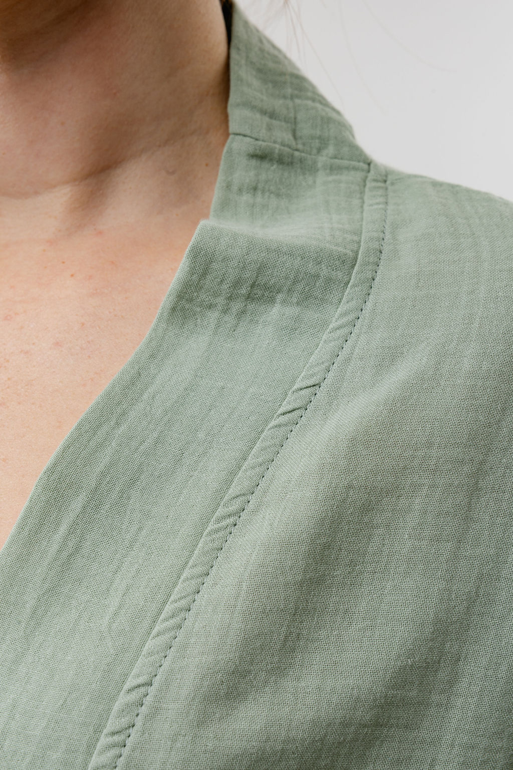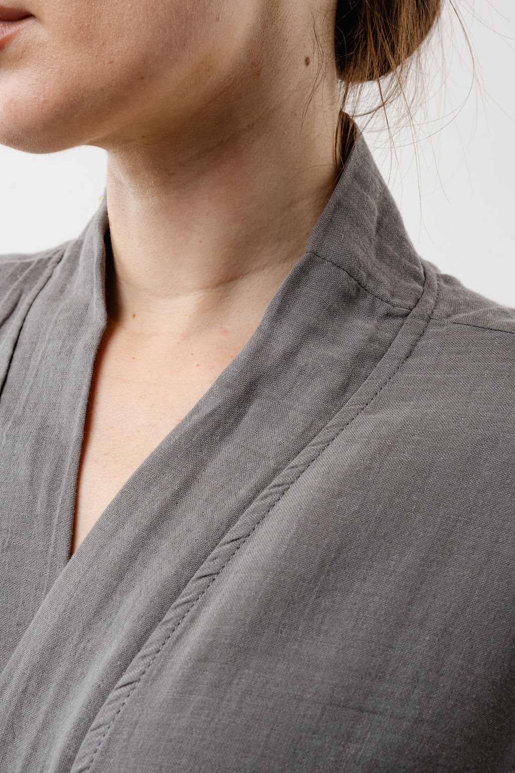 The wrap-style kimono jacket features a waist tie for adjustable styling — wear it open for a relaxed silhouette or tied for a polished look.
