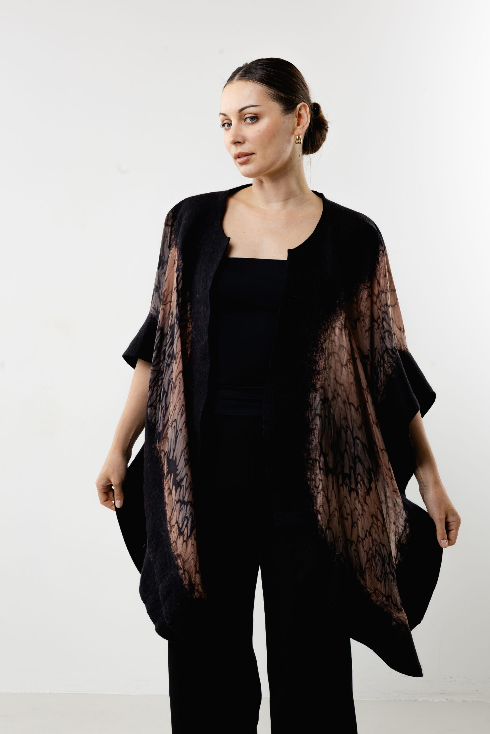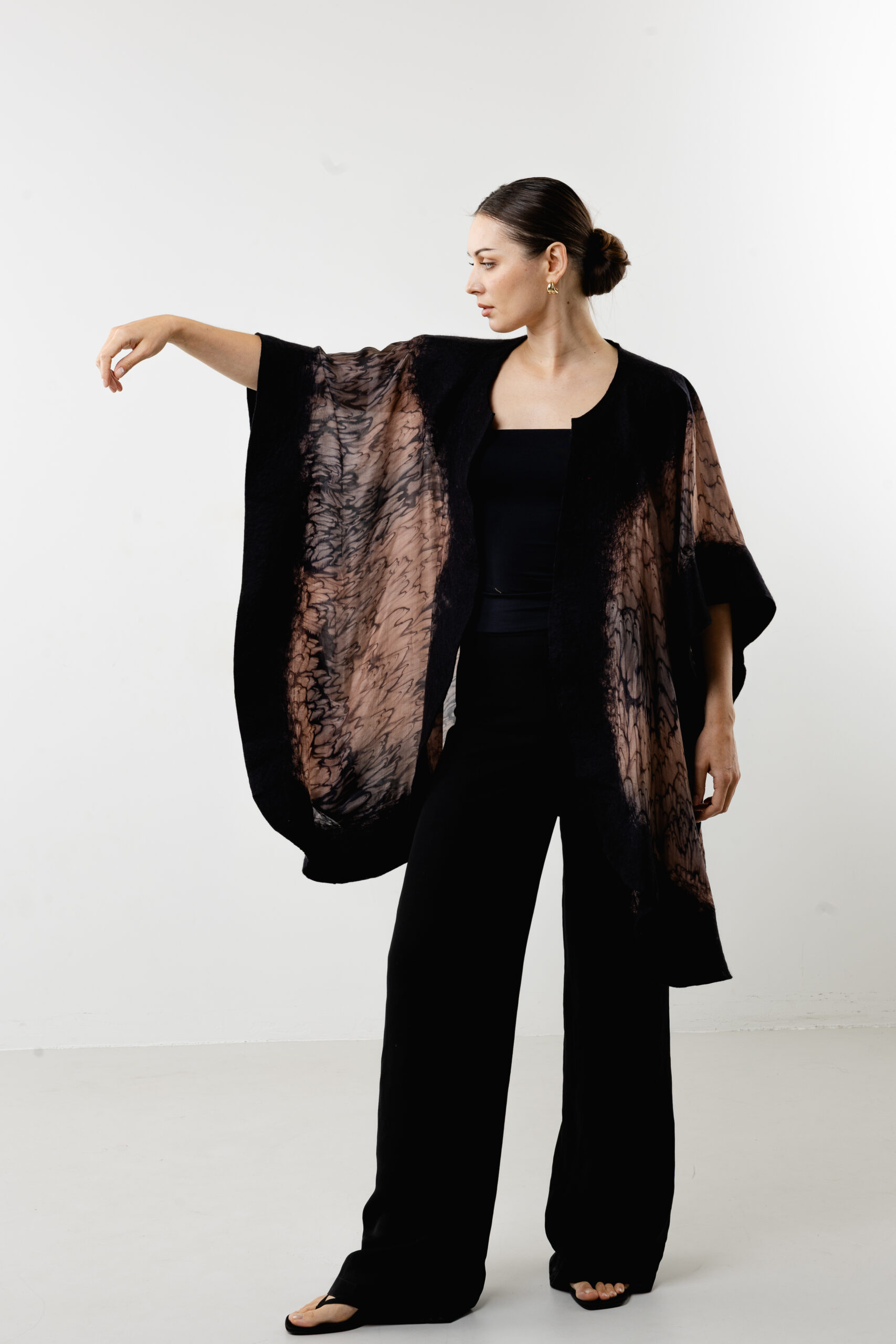 • Elegant Design: Features hand-painted silk panels in refined, neutral tones, harmoniously paired with artisanal felted wool textures — a true wearable work of art.