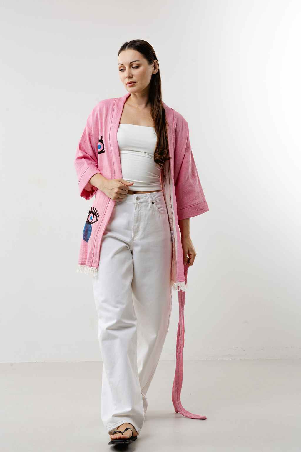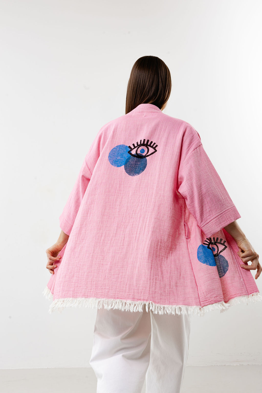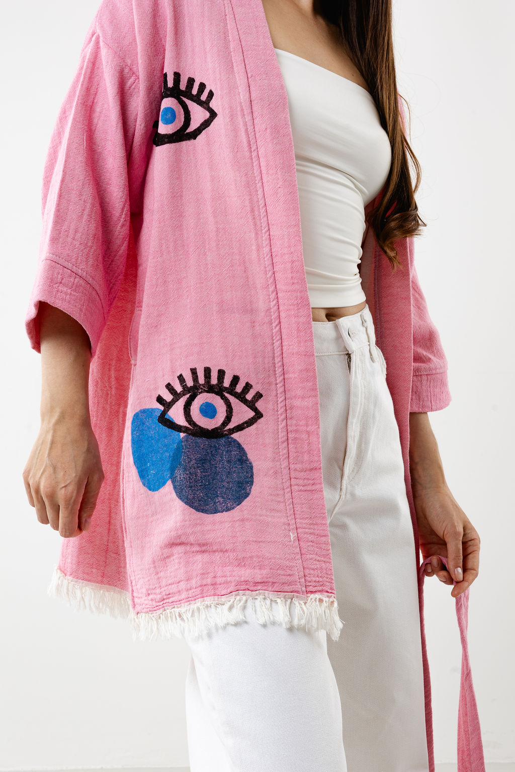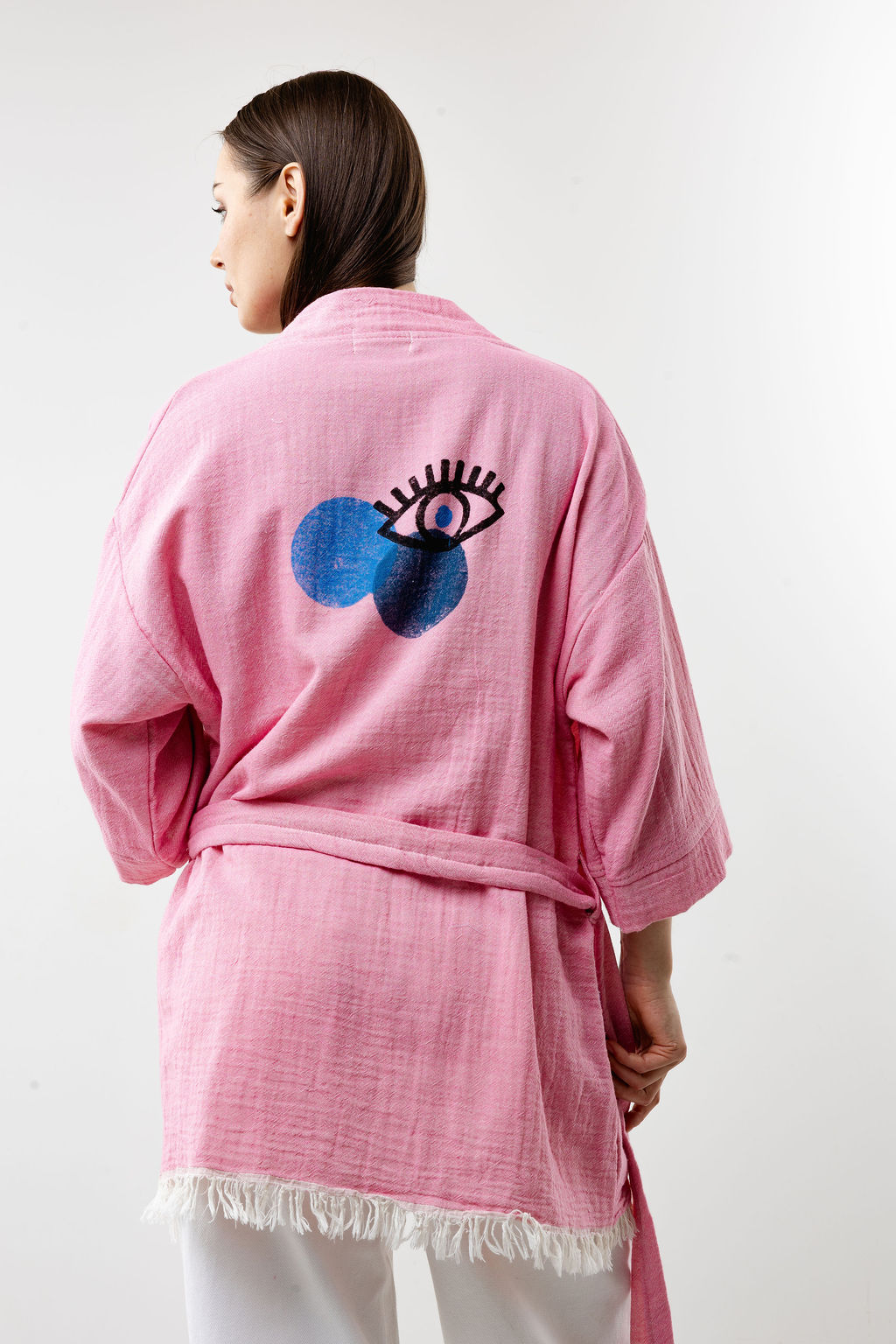 Its 100% Turkish cotton fabric is lightweight, breathable, and naturally absorbent, ideal for daily wear, spa relaxation, or beach outings. The pink base with hand-printed Eye motif adds a playful yet elegant touch. The adjustable waist tie and tassel-trimmed hem allow versatile styling—wear it open, tied at the waist, or layered over swimsuits and summer outfits.