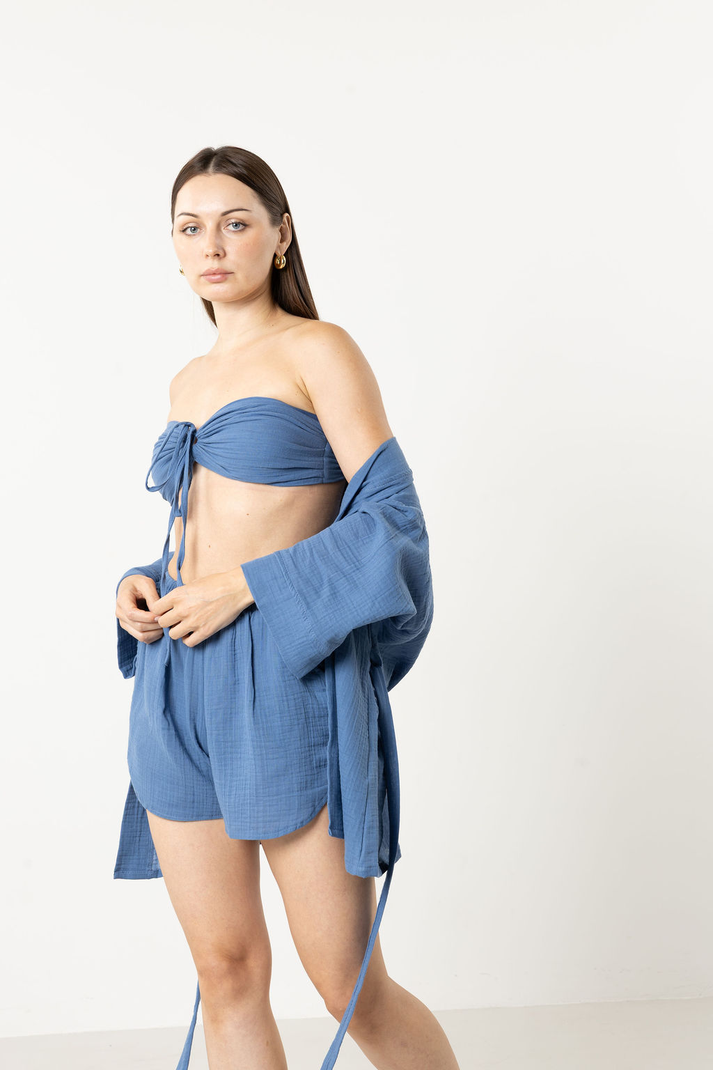 Women’s Soft Cotton Muslin Shorts & Bustier Set – lightweight, breathable, and perfect for summer. Crafted from double-layered natural cotton muslin, this two-piece set is ideal for beach, home, or casual outings. Minimal, chic, and eco-friendly, a must-have for your summer wardrobe.