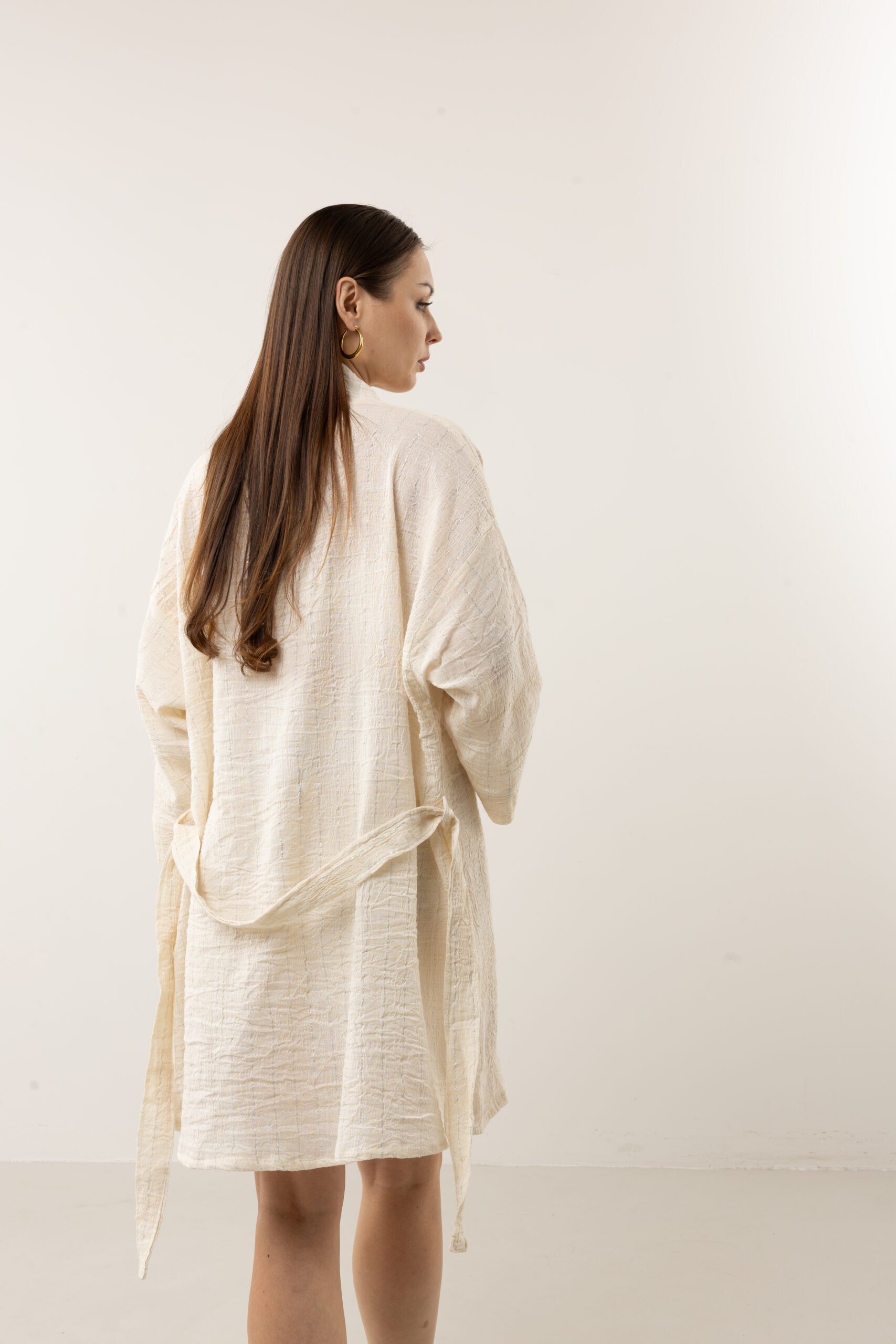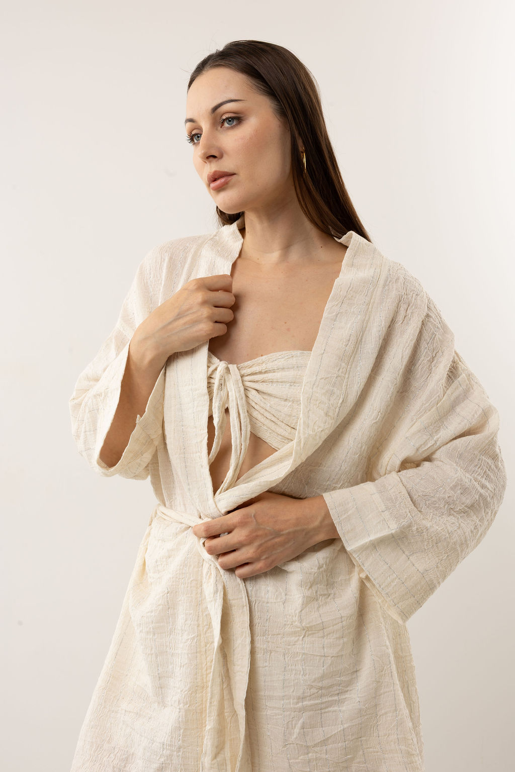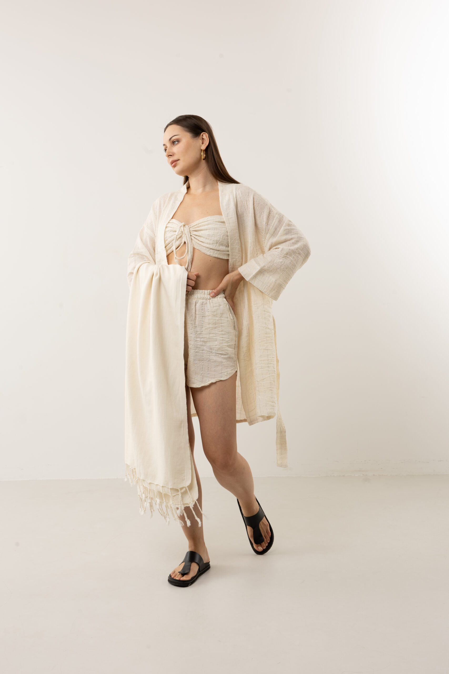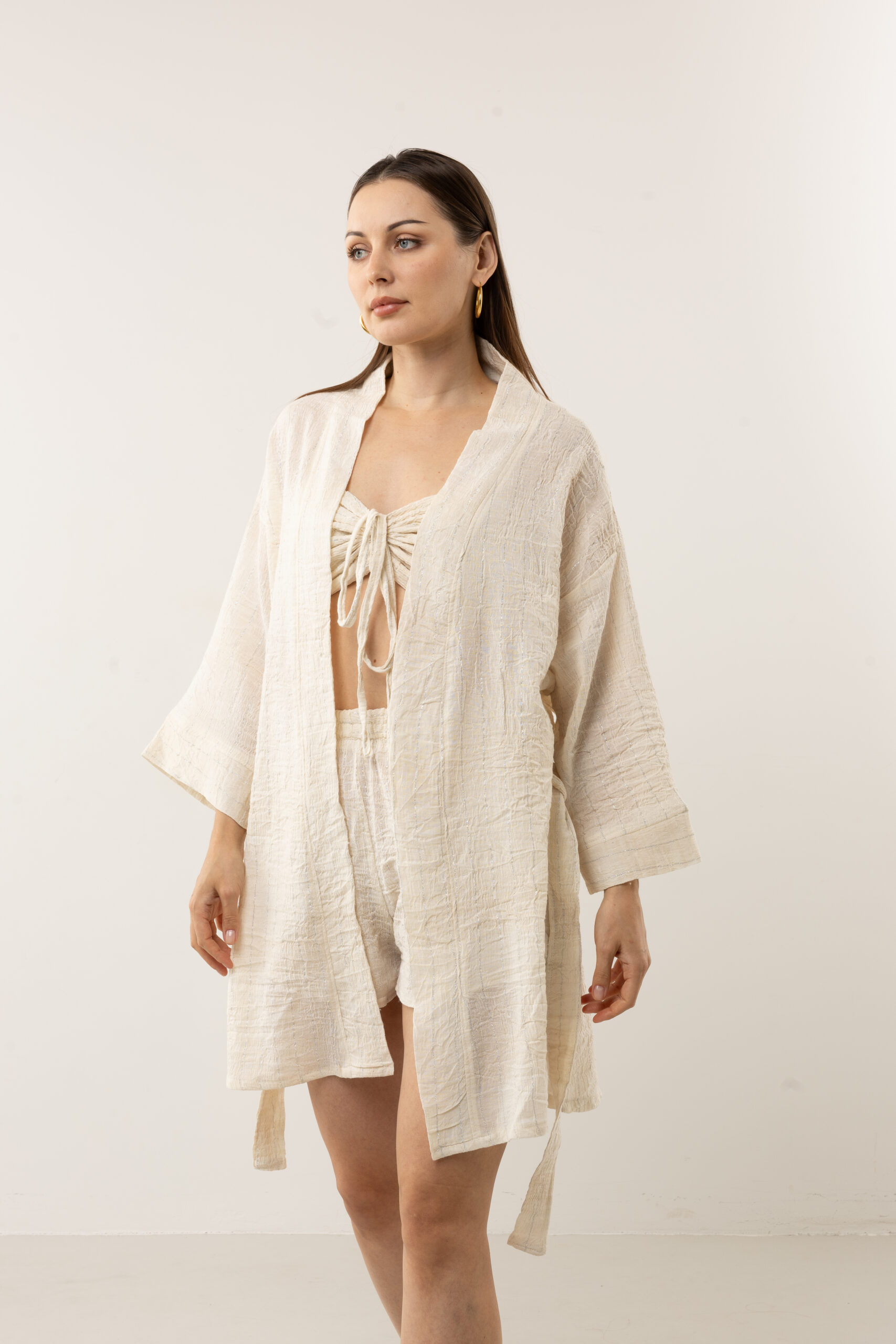 Elevate your style with the Starlight Silk Short Kimono, crafted from exclusive handwoven glitter silk with natural sparkling threads. Lightweight, soft, and subtly shimmering, this limited-edition kimono pairs perfectly with the Starlight Silk Shorts, Starlight Silk Pants, or Starlight Silk Bustier for a complete, luxurious look. Ideal for daywear, evening elegance, or chic lounging at home or spa.