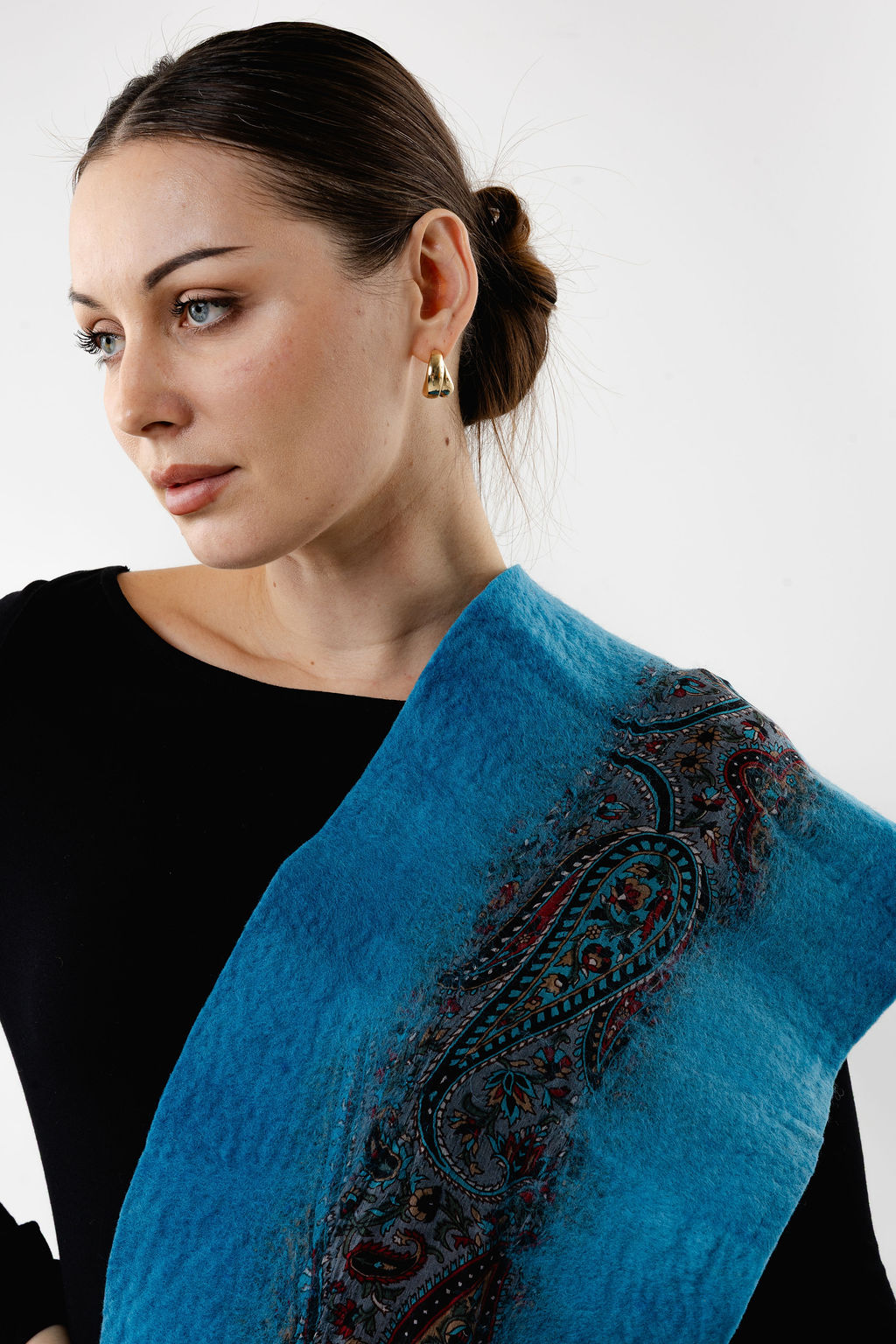 Soft,lightweight, hand-felted Merino wool blends seamlessly with flowing Turkish silk, creating a shawl that exudes warmth, sophistication, and artisanal refinement. Perfect for both elegant evenings and stylish daywear.