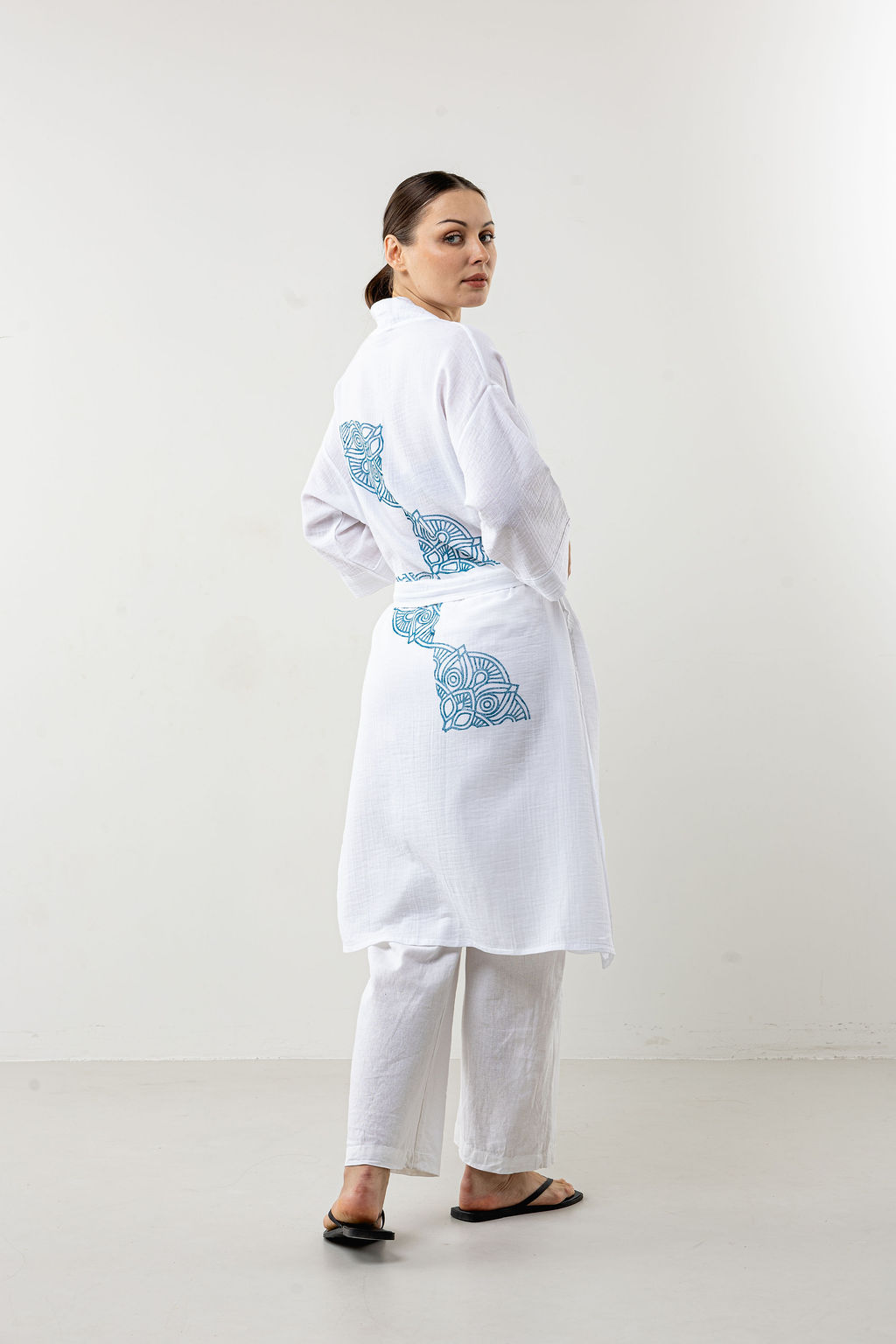 Experience the perfect combination of comfort, versatility, and artisanal craftsmanship with the Turquoise Semi-Mandala Handcrafted Muslin Kimono Tunic.