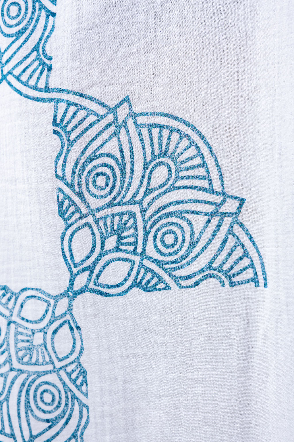 • Color & Pattern: White base with turquoise semi-mandala hand-printed design